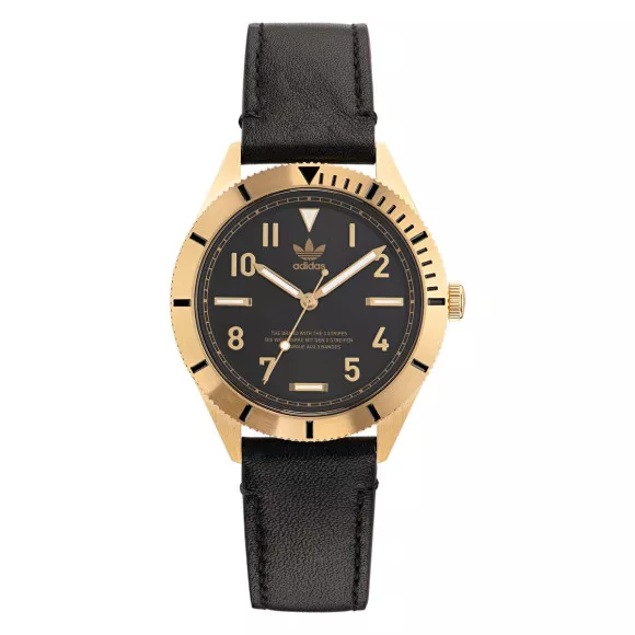 Ervaar de perfecte combinatie van stijl en functionaliteit met de Adidas Originals® Analogue 'Edition Three' Herrenkwatch AOFH22504. Ontworpen voor de moderne man, belichaamt dit horloge de geest van avontuur en precisie, iets wat Adidas Originals meesterlijk heeft vervaardigd in zijn gehele collectie. Het merk staat synoniem voor kwaliteit, sporterfgoed en innovatieve ontwerpen. Elk horloge van Adidas Originals is zorgvuldig geconstrueerd om duurzaamheid en tijdloze aantrekkingskracht te waarborgen, en spreekt mannen aan die zowel esthetiek als prestaties waarderen. Met dit horloge maak je niet zomaar een modeverklaring; je omarmt een levensstijl die authenticiteit en verfijning waardeert. De Adidas Originals® Analogue 'Edition Three' Herrenkwatch AOFH22504 heeft een opvallende gouden ronde kast van roestvrij staal, met een diameter van 41 mm en een slanke dikte van 9 mm. De wijzerplaat is gekleed in een gedurfde zwarte dial die de algehele esthetiek van het horloge elegant accentueert, beschermd door hoogwaardig mineraalglas dat zorgt voor helderheid en krasbestendigheid. Perfect voor diverse gelegenheden, zijn zwarte leren band heeft een comfortabele lengte van 21 cm en sluit veilig met een klassieke gespsluiting. Dit horloge is ontworpen om de ontberingen van het dagelijks leven te weerstaan, met een waterdichtheid van tot 5 bar, wat betekent dat het je vol vertrouwen kan vergezellen op elk avontuur zonder zorgen. Bovendien garandeert de quartz-beweging nauwkeurige tijdregistratie, waardoor het een ideale metgezel is voor degenen die het leven met opzet navigeren. Met een combinatie van verfijning en praktische bruikbaarheid, beschikt dit prachtige horloge ook over een lug-tot-lug hoogte van 48 mm en een lug-breedte van 19 mm, wat zorgt voor een comfortabele pasvorm voor elke polsmaat. Of je nu gekleed gaat voor een formele gelegenheid of casual uitgaat, dit horloge past zich naadloos aan jouw persoonlijke stijl aan. Met de Adidas Originals® Analogue 'Edition Three' Herrenkwatch AOFH22504 tellen elke seconde terwijl je vol vertrouwen en flair de avonturen van het leven omarmt.Koop Adidas Originals® Analogue 'Edition Three' Herrenkwatch AOFH22504 bij Ormoda