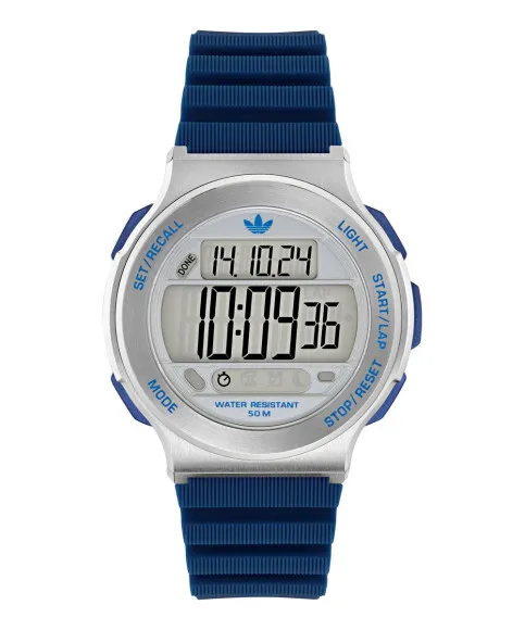 De Adidas Originals® Digital 'Expression Three Digital' Unisex Horloge AOFH25508 belichaamt een perfecte combinatie van stijl en functionaliteit. Met een opvallende ronde kast van zilverkleurig roestvrij staal, is deze horloge ontworpen voor elke gelegenheid en weerspiegelt het de sportieve maar chique essentie van het Adidas Originals merk. Met een diameter van 44 mm en een dikte van 11 mm, heeft het een lichtgewicht constructie met een gewicht van slechts 75 gram, waardoor het de hele dag comfortabel om je pols zit. De LCD-dial, beschermd door duurzaam mineraalglas, toont een modern digitaal display dat gemakkelijk af te lezen is, wat het zowel praktisch als stijlvol maakt. Deze unisex horloge heeft een levendige blauwe silicone band die niet alleen een kleuraccent toevoegt, maar ook zorgt voor een veilige en comfortabele pasvorm met een lengte van 20 cm en een breedte van 21 mm. Een betrouwbare gespsluiting garandeert dat je horloge op zijn plaats blijft, of je nu naar de sportschool gaat of uitgaat voor een casual uitje. Ontworpen voor gemak, beschikt de horloge over verschillende aanvullende functies, waaronder een stopwatch, een countdown timer, een alarm en een lampje, waardoor het geschikt is voor de dynamische levensstijl van de huidige consument. Maak je je zorgen over de duurzaamheid? De 'Expression Three Digital' is waterbestendig tot 5 bar, wat betekent dat je het zonder zorgen kunt dragen tijdens je dagelijkse activiteiten of licht zwemmen. Deze horloge is niet alleen een tijdpiece, maar ook een stijlvolle metgezel die zich aan jouw behoeften aanpast, zodat je je individualiteit met vertrouwen kunt uitdrukken.Koop Adidas Originals® Digital 'Expression Three Digital' Unisex Horloge AOFH25508 bij Ormoda