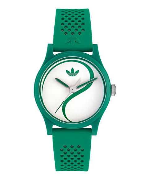 Adidas Originals® Analogue 'Game Two' Unisex Watch AOSY25519 biedt een naadloze combinatie van eigentijds ontwerp en betrouwbare functionaliteit, waardoor het het perfecte accessoire is voor stijlvolle individuen. Met zijn opvallende groene kunststof behuizing van 38 mm diameter, trekt deze horloge de aandacht terwijl het praktisch blijft. De ronde behuizing toont een levendig witte wijzerplaat, beschermd door mineraalglas, wat zorgt voor zichtbaarheid en duurzaamheid. De analoge weergave complimenteert het eenvoudige ontwerp van het horloge, waardoor het gemakkelijk is om de tijd te lezen in elke omgeving. Deze tijdmeter met waterdichtheid tot 5 bar is designed voor aqua-vriendelijkheid en functioneert op quartz beweging voor nauwkeurige tijdsaanduiding. De groene siliconen band, met een lengte van 20 cm en een breedte van 19 mm, biedt comfort en flexibiliteit voor elke pols. Het beschikt over een stevige gesp die zorgt voor een betrouwbare pasvorm, of je nu in de sportschool bent of uitgaat. Het lichte ontwerp, dat slechts 38 gram weegt, maakt het moeiteloos om de hele dag te dragen. Met een lug-to-lug hoogte van 46 mm en een behuizingsdikte van 9 mm, omarmt dit horloge de pols en biedt het een trendy uitstraling. Het Adidas Originals 'Game Two' horloge is ontworpen voor iedereen en valt op als een symbool van individualiteit en authenticiteit. Het unieke kleurenpalet maakt van dit horloge niet alleen een functioneel object; het is een statement accessoire dat elke outfit opleeft.Koop Adidas Originals® Analogue 'Game Two' Unisex Watch AOSY25519 bij Ormoda