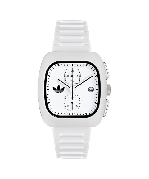 De Adidas Originals® Chronograph 'Retro Wave Two Chrono' Unisex's Watch AOSY24532 is een meesterlijke combinatie van stijl en functionaliteit, ontworpen voor degenen die zowel casual elegantie als praktische prestatie waarderen. Met een opvallende witte keramische kast van 39 mm in diameter, verenigt dit uurwerk moeiteloos duurzaamheid en een moderne esthetiek. De rechthoekige vorm biedt een unieke wending aan conventionele horlogedesigns, waardoor het een opvallende accessoire is voor je garderobe. Deze watch maakt gebruik van een precisiequartzbeweging, waardoor je altijd op tijd bent in stijl. De verfijnde chronografenfunctie laat je evenementen nauwkeurig timen, terwijl het makkelijk leesbare witte dial een schone, minimalistische uitstraling biedt. Het beschermende mineralen glasraam verhoogt de duurzaamheid, waardoor het geschikt is voor dagelijks gebruik. De kalenderfunctie biedt extra gemak, waardoor de functionaliteit verder wordt verhoogd om aan je dagelijkse behoeften te voldoen. De witte plastic band van het horloge is zowel comfortabel als stijlvol, met een lengte van 20 cm en een breedte van 20 mm, wat het een geweldige pasvorm voor elke pols maakt. De gespclasp zorgt voor een veilige pasvorm, zodat je het zonder zorgen kunt dragen terwijl je je dagelijkse activiteiten onderneemt. Met een waterdichtheid van 5 ATM, kun je met een gerust hart genieten, of je nu een casual dag hebt of buitenactiviteiten onderneemt. Het totale lichte ontwerp, met slechts 46 gram, maakt dit uurwerk een ideale metgezel voor langdurig gebruik, wat de perfecte balans tussen sportiviteit en verfijning belichaamt.