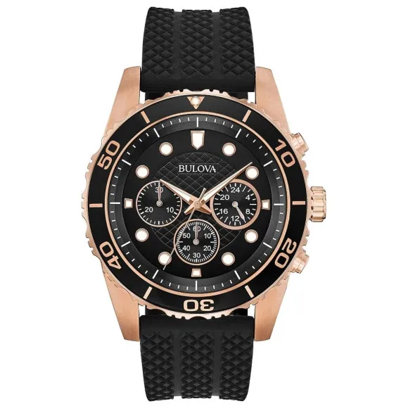 Ontdek de Bulova® Chronograph 'Sports Chronograph' Herenhorloge 98A192, een tijdpiece die precisie en avontuur belichaamt. Dit duikershorloge is vakkundig gemaakt voor de moderne man die zowel functionaliteit als stijl waardeert. Met een robuuste ronde kast van 43 mm, vervaardigd uit roestvrij staal, biedt dit horloge niet alleen duurzaamheid, maar straalt het ook luxe uit dankzij de prachtige kastkleur in roségoud. De zwarte wijzerplaat biedt een scherp contrast, waardoor het gemakkelijk af te lezen is in elke lichtomstandigheid. Een venster van mineralen glas beschermt de wijzerplaat, zodat deze tijdens al je verkenningen onbeschadigd blijft. Uitgerust met een betrouwbare quartzbeweging is dit chronografische duikershorloge ontworpen voor degenen die een actief leven leiden. Het beschikt over een zwarte rubberen band die zowel comfortabel als veilig is en perfect om de pols past met een lengte van 21 cm en een breedte van 21 mm. De gesp zorgt ervoor dat het horloge goed op zijn plaats blijft, ongeacht hoe uitdagend het avontuur ook is. Met een waterbestendigheid tot 10 bar is dit horloge perfect voor duikliefhebbers en dagelijkse draagbare mode. Met een gewicht van 102 gram is de Bulova Chronograph 'Sports Chronograph' de perfecte combinatie van comfort en stijl. De precieze hoogte van 53 mm van lug tot lug maakt het ideaal voor alle polsgroottes. Of je nu in de vergaderzaal bent of onder water, dit horloge is ontworpen voor precisie en elegantie, waardoor het een perfecte aanvulling op je collectie is.