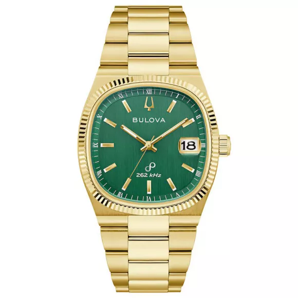 De bulova super seville 97b237 voor heren is uitgerust met een quartz uurwerk en een rvs kast. De groen wijzerplaat is gehuisvest in een goudkleurig gekleurde kast en een goudkleurig rvs band. Het horloge wordt geleverd in een originele doos en heeft een garantie van 2 jaar.