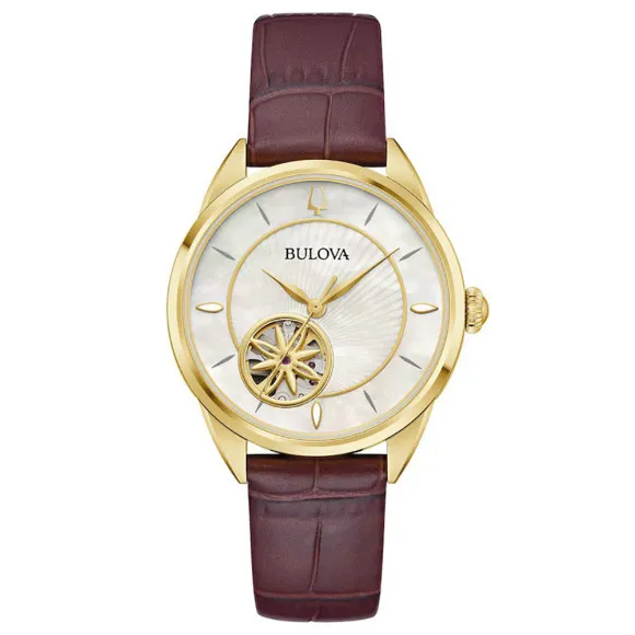Verwen uzelf met de elegante charme van de Bulova Analogue 'Sutton' Dameshorloge 97L179. Dit exquisite stuk is perfect voor de moderne vrouw die waardering heeft voor verfijning en stijl. De watch beschikt over een stralende moeder van parel wijzerplaat die prachtig contrasteert met de rijke gouden tinten van de roestvrijstalen kast. Met zorgvuldige aandacht voor detail is het ontworpen met een ronde kastdiameter van 34mm en een dikte van 11mm, waardoor hij de hele dag comfortabel op de pols zit. Het saffierglas biedt duurzaamheid en verbetert de algehele esthetiek van het horloge, waardoor het een verrukkelijke aanvulling is op elke juwelencollectie. De luxe bruine leren band is niet alleen stijlvol, maar biedt ook een comfortabele pasvorm, met een breedte van 15mm en een lengte van 19cm. Het klassieke gespontwerp zorgt voor een veilige pasvorm, waardoor je het met vertrouwen kunt dragen op elke gelegenheid. Met een indrukwekkende waterbestendigheid van tot 3 bar is dit uurwerk ontworpen om de dagelijkse uitdagingen aan te kunnen terwijl het zijn elegantie behoudt. Dit horloge wordt aangedreven door een automatische beweging, wat Bulova's toewijding aan precisie en betrouwbaarheid weerspiegelt. De 'Sutton' combineert luxe en functionaliteit naadloos, waardoor het een veelzijdige accessoire is voor zowel dag- als avondkleding. Of het nu wordt gecombineerd met formele kleding of een casual outfit, dit horloge zal zeker een statement maken en zal jarenlang gekoesterd worden.Koop Bulova® Analogue 'Sutton' Dameshorloge bij Ormoda