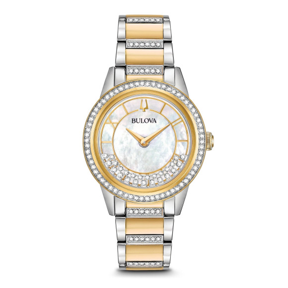 Bulova, een merk dat synoniem staat voor vakmanschap en innovatie, heeft sinds de oprichting in 1875 continu de grenzen verlegd van wat mogelijk is binnen de uurwerkenindustrie. Deze toewijding aan uitmuntendheid komt tot uiting in elk stijlvol ontwerp dat zijn weg naar uw pols vindt. De Bulova® Analoge 'Turnstyle' Dameshorloge 98L245 is een stralende samensmelting van klassieke elegantie en moderne schittering. De 32mm ronde roestvrijstalen kast omarmt een betoverende parelmoeren wijzerplaat, waarop steentjes zijn gezet voor een subtiel spel van licht en textuur. Dit quartz uurwerk is niet enkel punctueel, het is een expressie van goede smaak en geraffineerdheid. Met de veelkleurige afwerking is dit uurwerk een echte blikvanger die bij allerlei outfits zal passen. De horlogeband van 19cm in dezelfde veelkleurige roestvrij staal, afgesloten met een verfijnde vouwsluiting, zorgt voor comfort en duurzaamheid. De waterbestendigheid van 3 bar en het krasvaste mineraalglas maken dit horloge niet alleen mooi, maar ook praktisch voor dagelijks gebruik. Met gratis expresverzending via premium koeriers, kunt u snel genieten van uw Bulova horloge. Mocht het nodig zijn, kunt u gebruik maken van onze 30-daagse gratis retourbeleid. Daarnaast ontvangt u een tweejarige garantie en staat onze klantenservice altijd klaar om al uw vragen met gedegen kennis van zaken te beantwoorden. Ormoda brengt u deze service met trots, gesteund door onze rijke ervaring sinds 1976.Koop Bulova® Analoge 'Turnstyle' Dameshorloge 98L245 bij Ormoda