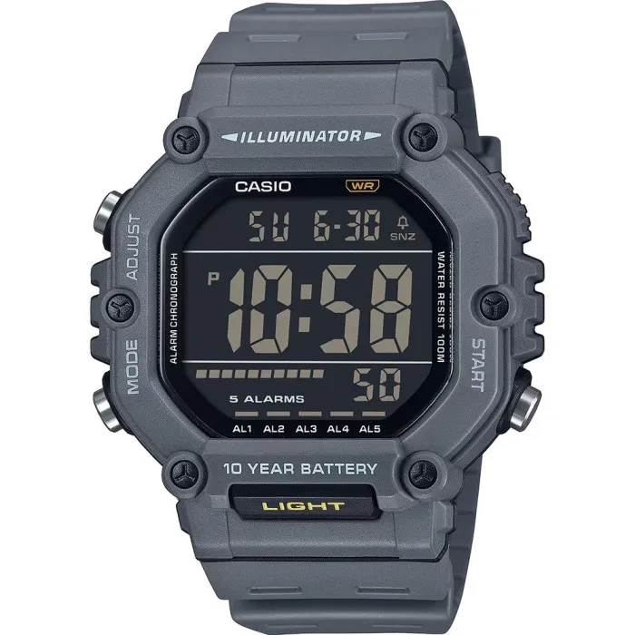 De Casio® Digital 'Casio Collection' Herenhorloge AE-1600H-8BVEF is de perfecte mix van stijl en functionaliteit, die de essentie van een moderne levensstijl belichaamt. Ontworpen voor degenen die precisie en praktisch nut waarderen, is dit tijdpiece voorzien van een slank rechthoekig uurwerk gemaakt van duurzame hars in een verfijnd grijs. Het horloge is 50mm lang en 44mm breed, waardoor het een veelzijdige accessoire is voor elke gelegenheid. De zwarte wijzerplaat, beschermd door mineraalglas, toont een digitale weergave die gemakkelijk af te lezen is, zodat je altijd stijlvol op tijd bent. Met zijn quartz uurwerk belooft dit horloge nauwkeurigheid en betrouwbaarheid. De robuuste plastic band, van 26mm breed en tot 21cm lang, biedt niet alleen comfort, maar benadrukt ook het totale ontwerp met zijn bijpassende grijze kleur. Uitgerust met een veilige gesp, zit het horloge comfortabel om je pols en blijft het op zijn plaats tijdens je dagelijkse activiteiten. Dit tijdpiece is meer dan alleen een horloge; het is een praktische metgezel met een reeks functies, waaronder een stopwatch, countdown timer, dubbele tijd, alarm en een licht voor zichtbaarheid in omstandigheden met weinig licht. Met een waterbestendigheid tot 20 bar, kun je zonder zorgen op avontuur gaan. Het slanke ontwerp in combinatie met uitstekende functionaliteit maakt de Casio® Digital 'Casio Collection' Herenhorloge AE-1600H-8BVEF tot een ideale keuze voor de moderne man die zowel esthetiek als nut waardeert.Koop Casio® Digital 'Casio Collection' Herenhorloge bij Ormoda