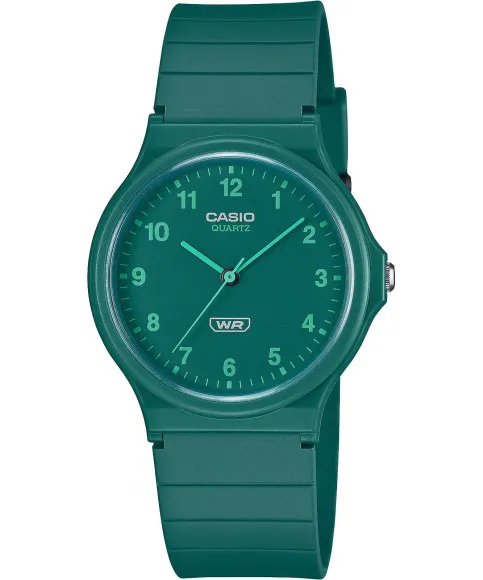 Maak kennis met het Casio® Analoge 'Casio Collection' Unisex Horloge MQ-24B-3BEF, waar functionaliteit samenkomt met een opvallende stijl. Dit horloge, ontworpen met een stijlvolle groene wijzerplaat en bijpassende resin behuizing, belichaamt de innovatieve geest van Casio. Bekend om zijn betrouwbaarheid, heeft Casio naam gemaakt in de horlogewereld door moderne technologie te combineren met aantrekkelijke ontwerpen. De analoge weergave biedt een klassieke look, waarmee je de tijd altijd in één oogopslag kunt zien. Met een quartz-uurwerk dat precisie garandeert, is dit horloge ideaal voor zowel dagelijkse wear als speciale gelegenheden. De ronde behuizing van 34mm en een dikte van 8mm zorgen voor een comfortabele, maar stevige pasvorm, geschikt voor elke pols. De band van 20cm kan worden aangepast voor een perfecte fit, terwijl de breedte van 18mm een verfijnde esthetiek behoudt. Het mineraalglas venster van de wijzerplaat biedt duurzaamheid en de plastic band maakt het horloge zowel stijlvol als functioneel. Met een waterbestendigheid tot 3 bar is het Casio® Analoge 'Casio Collection' horloge een veelzijdige metgezel voor elk avontuur, die je op tijd houdt, waar het leven je ook brengt.