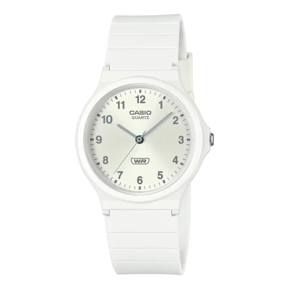 Maak kennis met de Casio® Analoge 'Casio Collectie' Dameshorloge MQ-24B-7BEF, een perfecte fusie van elegantie en tijdloze stijl. Dit horloge belichaamt eenvoud met zijn minimalistische witte wijzerplaat, ontworpen om elke outfit aan te vullen en tegelijkertijd te voldoen aan de casual maar chique levensstijl van moderne vrouwen. Met een ronde kunststof kast van 34 mm in diameter en slechts 8 mm dik, biedt het zowel comfort als duurzaamheid, waardoor het een ideale accessoire is voor dagelijks gebruik. Het lichte ontwerp, met een gewicht van slechts 20 gram, zorgt voor een comfortabele pasvorm gedurende de dag. Het horloge beschikt over een heldere witte wijzerplaat met gemakkelijk leesbare uurmarkeringen, beschermd door een duurzame mineraalglazen ruit die bijdraagt aan de robuustheid. De analoge weergave biedt een klassieke toets, zodat je altijd elegant de tijd kunt bijhouden. De stevige witte kunststof band, met een lengte van 19 cm en een breedte van 18 mm, is afgewerkt met een veilige gesp voor comfortabel dragen. Met een waterbestendigheidsclassificatie van 3 bar is dit horloge veelzijdig genoeg om spetters en regen te weerstaan, waardoor het geschikt is voor dagelijkse activiteiten of casual uitjes. Het stijlvolle ontwerp van het Casio Collectie-horloge voldoet ook aan de behoeften van vrouwen die een balans waarderen tussen functionaliteit en mode. Perfect om te combineren met zowel casual kleding als voor een speciale gelegenheid, dit tijduur is de belichaming van slimme stijl en praktisch nut. Verhoog je accessoire-spel met deze verfijnde tijdmeter die elegantie moeiteloos combineert met dagelijks gebruik.