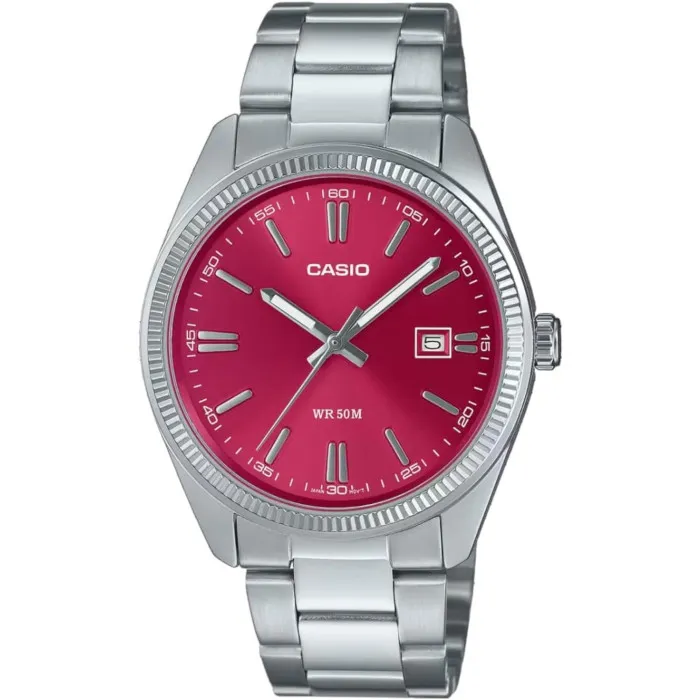 Het Casio® Analogue 'Casio Collection' Heren Horloge MTP-1302PD-4AVEF is een prachtig stuk dat de perfecte combinatie van stijl en functionaliteit belichaamt. Met zijn opvallende rode wijzerplaat, is dit casual horloge zeker een blikvanger terwijl het tegelijkertijd zeer praktisch is voor dagelijks gebruik. De horlogekast, vervaardigd uit duurzaam messing, heeft een zilveren afwerking die de levendige wijzerplaat aanvult, waardoor het een verfijnde uitstraling heeft voor elke gelegenheid. Met een diameter van 38mm en een dikte van slechts 9mm, zit dit tijdstuk comfortabel om de pols, wat het een uitstekende keuze maakt voor mannen die comfort en stijl waarderen. Dit horloge werkt met een betrouwbare quartz beweging, wat zorgt voor nauwkeurige tijdsregistratie, zodat je nooit een belangrijk moment mist. Het geharde mineraalglas wijzerplaat biedt weerstand tegen krassen, wat de levensduur van dit opvallende stuk verlengt. Daarnaast is het horloge waterbestendig tot 5 bar, wat het geschikt maakt voor dagelijkse activiteiten, of je nu een dag op kantoor doorbrengt of een avond uit gaat. De roestvrijstalen band van 21cm lang en 18mm breed voegt een vleugje elegantie toe terwijl het tegelijkertijd duurzaamheid garandeert. De vouwsluiting met drukknop vermindert de kans op toevallig openen, wat zowel veiligheid als gebruiksgemak belooft. Bovendien voegt de datumkalenderfunctie, die netjes op de wijzerplaat is geplaatst, praktische nuttigheid toe aan dit klassieke ontwerp. Het totale gewicht van 104 gram weerspiegelt de hoogwaardige materialen die in de constructie zijn gebruikt, en combineert elegantie en robuustheid moeiteloos. Ontworpen voor de moderne man, is het Casio® Analogue 'Casio Collection' Heren Horloge niet alleen een tijdmeetinstrument; het is een statementaccessoire dat elke outfit verbetert.