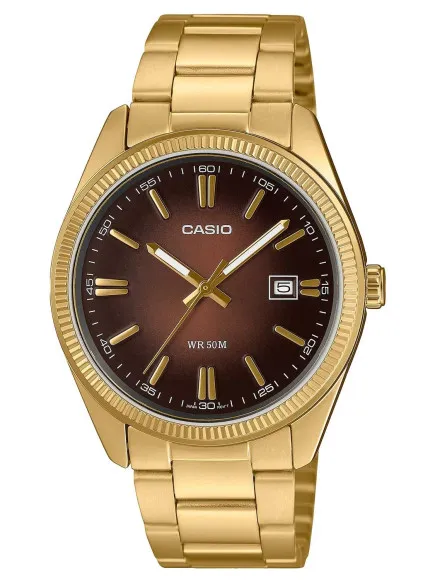 Casio® Analogue 'Casio Collection' Herenhorloge MTP-1302PGC-5AVEF is een perfecte combinatie van elegantie en functionaliteit, ontworpen voor de moderne gentleman. Dit horloge heeft een verfijnde ronde kast van duurzaam roestvrij staal, met een diameter van 38mm en een dikte van 9mm. De glanzende gouden kastkleur komt prachtig overeen met de opvallende bruine wijzerplaat, die wordt beschermd door robuust mineraalglas. De analoge wijzerplaat dient niet alleen esthetische doeleinden, maar biedt ook praktische functionaliteit met een duidelijke datumkalender. Dit horloge is ontworpen voor dagelijks gebruik en is waterbestendig tot 5 bar, wat zorgt voor betrouwbaarheid in verschillende omgevingen. Het horloge wordt ondersteund door een luxueuze gouden roestvrijstalen band die 21cm lang en 19mm breed is, en beschikt over een vouwsluiting met een drukknopmechanisme voor eenvoudig verstellen. Met een totaalgewicht van slechts 106 gram is het comfortabel om te dragen, maar tegelijkertijd stevig genoeg voor dagelijks gebruik. De harmonieuze vormgeving en superieure technologie van dit horloge maken het een verstandige keuze voor elke gelegenheid, of het nu gaat om professionele bijeenkomsten, sociale evenementen of casual uitjes. Elk detail van het Casio Collection horloge weerspiegelt de toewijding van het merk aan kwaliteit en stijl, waardoor het de perfecte accessoire is voor de veeleisende man.
