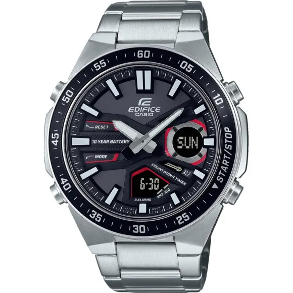 Het Casio® Analogue-digital 'Edifice' Herenhorloge EFV-C110D-1A4VEF heeft een onderscheidende sportieve stijl die resoneert met mannen die zowel elegantie als duurzaamheid waarderen. De kast van het horloge, gemaakt van roestvrij staal, heeft een diameter van 46 mm, wat de perfecte balans vindt tussen gedurfd en verfijnd. De ronde kast heeft een dikte van 13 mm, wat zorgt voor een stevige constructie terwijl het lichtgewicht blijft. Bovendien biedt het de unieke analoge en digitale weergave die aanspreekt bij verschillende wensen. Door de mineraalglazen wijzerplaat is de helderheid geoptimaliseerd, terwijl de lichtgevende wijzers zorgen voor zichtbaarheid onder moeilijke lichtomstandigheden. Dit horloge is uitgerust met een duurzame zilveren roestvrijstalen band die 21 cm lang en 24 mm breed is, waardoor het een veilige pasvorm biedt met een vouwsluiting met drukknoop. Het horloge bevat nuttige functies zoals een stopwatch, een terugtellingsfunctie, een alarm en wereldtijd, perfect geschikt voor een actief leven. Met een waterdichtheid van 10 bar is het geschikt voor spetters en kort onderdompeling, wat het perfect maakt voor sportliefhebbers die functionaliteit willen zonder in te boeten op stijl. Met een gewicht van 166 g is het comfortabel voor langdurig dragen. Over Casio® Analogue-digital 'Edifice' Herenhorloge EFV-C110D-1A4VEF