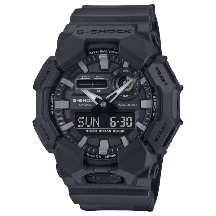 Ontdek het Casio Analogue-digital 'G-shock' Herenhorloge GA-010-1A1ER, waar geavanceerde technologie samenkomt met robuust ontwerp. Dit horloge is niet zomaar een tijdpiece; het is een metgezel voor degenen die avontuur zoeken. Met een robuuste zwart kunststof behuizing van 50 mm en een dikte van 15 mm weerspiegelt het horloge kracht en duurzaamheid die geschikt zijn voor de levensstijl van elke man. De opvallende zwarte wijzerplaat toont een onberispelijke combinatie van analoge en digitale displays, die het gemakkelijk maakt om de tijd te lezen, zelfs onder verschillende lichtomstandigheden dankzij het mineralen glas. Of je nu aan het werk bent, aan het sporten of geniet van het buitenleven, dit horloge staat symbool voor veerkracht. Het Casio G-shock is ontworpen met precisie kwartsbeweging, wat zorgt voor nauwkeurige tijdregistratie. De stijlvolle zwarte kunststof band, met een lengte van 21 cm en een breedte van 24 mm, vul het kastje prachtig aan en biedt comfort en flexibiliteit. De gespsluiting garandeert een veilige pasvorm, waardoor het een ideale keuze is voor activiteiten met hoge impact. Dit horloge is ook uitgerust met essentiële functies zoals een stopwatch, countdown timer, wereldtijdfunctie, alarm en verlichte achtergrond, zodat je alle tools die je nodig hebt bij de hand hebt. Met een indrukwekkende waterbestendigheid van 20 bar kun je zonder aarzeling in je aquatische avonturen duiken. Het gaat niet alleen om esthetiek; dit horloge is ontworpen voor de moderne man die houdt van een combinatie van stijl en functionaliteit. Het Casio Analogue-digital 'G-shock' Herenhorloge GA-010-1A1ER is een perfecte aanvulling voor degenen die duurzaamheid en geavanceerde functies in hun tijdpiece waarderen.