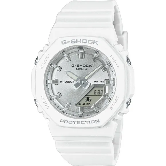 De Casio® Analogue-digital 'G-shock' Dameshorloge GMA-P2100VA-7AER is een uitstekende combinatie van stijl en duurzaamheid, perfect voor de moderne vrouw die zowel mode als functionaliteit omarmt. Met een slank witte hars kast van 40 mm in diameter en slechts 11 mm dik, is dit horloge lichtgewicht en comfortabel voor dagelijks gebruik. De ronde wijzerplaat, met een opvallende zilveren kleur, is een wonder van dual-display dat zowel analoge als digitale aflezingen biedt, wat tegemoetkomt aan al je tijdsaanduidingsbehoeften. Of je nu aan het werk bent, aan het spelen bent of op avontuur gaat, de veelzijdigheid van dit horloge zorgt ervoor dat je op tijd blijft zonder in te boeten op stijl. Een opmerkelijke eigenschap van dit horloge is de indrukwekkende functionaliteit. Gemaakt om veerkrachtig te zijn, kan het water weerstaan tot 20 bars, waardoor het perfect is voor zwemmen of genieten van watersporten. Naast tijdsaanduiding beschikt het over een kalender voor dag-datum weergave, een stopwatch, een afteltimer, wereldtijd, een alarm en zelfs een licht voor die nachtelijke escapades. De witte plastic band van 19 cm lang en 21 mm breed heeft een veilige gesp, wat je zowel comfort als gebruiksgemak biedt. Met een gewicht van slechts 41 gram is het licht genoeg om te vergeten dat je het draagt, terwijl het nog steeds een gedurfde indruk maakt. Dit horloge is speciaal ontworpen voor vrouwen die waardering hebben voor een sportieve maar toch verfijnde accessoire. Elke functie is zorgvuldig vervaardigd om je dagelijkse leven te verbeteren, en overbrugt de kloof tussen utiliteit en elegantie. Wanneer je voor dit G-shock model kiest, koop je niet alleen een horloge; je investeert in een levenslange metgezel die je avontuurlijke geest weerspiegelt en versterkt.