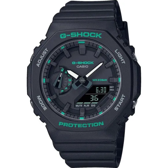 De Casio® Analogue-digital 'G-shock' Dameshorloge GMA-S2100GA-1AER belichaamt de perfecte fusie van elegantie en sportiviteit, waardoor het een ideaal accessoire is voor de actieve vrouw. Met een robuuste zwarte kunststof kast van 42 mm in diameter en een slanke dikte van slechts 11 mm, combineert dit horloge stijl en duurzaamheid op een naadloze manier. De opvallende zwarte wijzerplaat, beschermd door mineraalglas, toont zowel analoge als digitale displays, wat zorgt voor een intuïtieve leeservaring met functies zoals een dag-datum kalender, stopwatch, timer en alarm om je te helpen in je dagelijkse activiteiten. Het horloge is ontworpen om bestand te zijn tegen 20 bar waterdruk, waardoor het geschikt is voor watersporten of dagelijks gebruik zonder zorgen. De verstelbare kunststof band van 19 cm en een breedte van 22 mm zorgt voor een comfortabele pasvorm om je pols, veilig vastgemaakt met een duurzame gesp. Gewicht is slechts 42 gram, waardoor je het moeiteloos de hele dag kunt dragen. Perfect voor zowel casual uitjes als sportievere bezigheden, dit veelzijdige horloge vertelt niet alleen de tijd, maar verfijnt ook je stijl en weerspiegelt je persoonlijkheid als een levendige en moderne vrouw. Of je nu een fitnessdoel nastreeft of geniet van een ontspannen dag buiten, dit horloge sluit aan bij je energieke levensstijl en voegt een vleugje verfijning toe aan je looks.Koop Casio® Analogue-digital 'G-shock' Dameshorloge GMA-S2100GA-1AER bij Ormoda