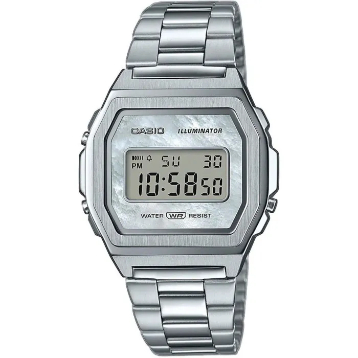 De Casio® Digital 'Vintage' Dameshorloge A1000D-7EF is een elegante mix van moderne functionaliteit en tijdloze charme. Ontworpen voor de hedendaagse vrouw, heeft dit horloge een glanzende zilveren kast gemaakt van duurzaam roestvrij staal, wat perfect aansluit bij de chique vierkante vorm van 36 mm. Het slanke profiel met een dikte van slechts 7 mm zorgt ervoor dat het horloge perfect om de pols zit zonder ongemakkelijk te zijn. Gezet tegen een betoverende parelmoer wijzerplaat, zorgt het digitale display voor eenvoudige leesbaarheid, versierd met een mineraal glazen venster dat krasbestendigheid en helderheid biedt. Dit casual maar stijlvolle uurwerk is voorzien van een betrouwbaar quartz uurwerk, wat precisie in het bijhouden van de tijd garandeert. Het horloge beschikt over een dag-datum kalenderfunctie, wat je helpt georganiseerd te blijven en bijdraagt aan de veelzijdige aantrekkingskracht. Het horloge heeft een comfortabel 20 cm lang roestvrijstalen band dat naadloos samensmelt met je pols, compleet met een inklapbare sluiting met een drukknop voor eenvoudig dragen. Met een waterbestendigheid van 3 bar, is het bestand tegen alledaagse spetters, waardoor het perfect is voor de drukke vrouw. Met een gewicht van slechts 87 gram kan het horloge de hele dag gedragen worden zonder ongemak. Of je nu naar een vergadering gaat of geniet van een casual uitje, de Casio® Digital 'Vintage' Dameshorloge past moeiteloos in elke levensstijl. Het duurzame ontwerp en de betrouwbare prestaties maken het een essentieel accessoire voor degenen die klassieke elegantie combineren met moderne gemakken.Koop Casio® Digital 'Vintage' Dameshorloge A1000D-7EF bij Ormoda