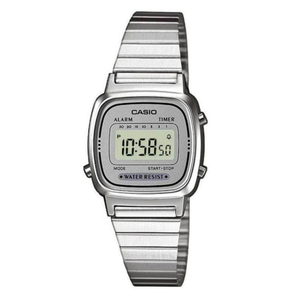 De Casio® Digital 'Vintage' Dameshorloge LA670WEA-7EF vangt de essentie van tijdloze elegantie, samengevoegd met moderne technologie. De aantrekkelijke zilveren kunststof kast, met een lengte van slechts 25mm en een dikte van 7mm, maakt het horloge lichtgewicht en toch uiterst duurzaam. Het ontwerp straalt vrouwelijke charme uit en is ideaal voor elke casual gelegenheid. De grijze horlogeklok, beschermd door stevig kunststof glas, complementeert de algehele esthetiek prachtig. Een digitaal display voldoet aan de wensen van moderne vrouwen die praktische stijl verlangen. Met een kalender voor dag, datum en maand houdt dit horloge je altijd georganiseerd en op tijd. De band van roestvrij staal heeft een handige klapsluiting, die zorgt voor een veilige pasvorm en comfortabel draaggemak met een lengte van 19cm. De band meet 11mm in breedte, wat de proporties van het horloge perfect in balans brengt. Met 3 bar waterbestendigheid houdt het horloge tegen spatjes en korte onderdompeling, wat het perfect maakt voor dagelijkse activiteiten. Met slechts 32 gram is het licht genoeg om de hele dag te dragen zonder dat je je belast voelt. De combinatie van klassieke en eigentijdse ontwerpelementen in dit horloge spreekt tot diegenen die zowel functionaliteit als stijl waarderen in hun accessoires. In de mode is veelzijdigheid essentieel, en dit horloge gaat moeiteloos van dag naar nacht, wat het een basisstuk maakt in de collectie van elke vrouw. Of je nu casual gekleed bent of een outfit wilt verfraaien, dit stuk staat als een bewijs van persoonlijke stijl en verfijning.Koop Casio® Digital 'Vintage' Dameshorloge bij Ormoda