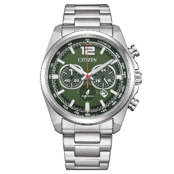 Het Citizen® Chronograph Herenhorloge vangt de essentie van tijdloze elegantie, samengevoegd met moderne functionaliteit. Dit meesterlijk vervaardigde uurwerk beschikt over een verbluffende groene wijzerplaat, geplaatst binnen een robuuste ronde behuizing van rvs van 41mm. Met een dikte van slechts 12mm straalt het een substantieel maar comfortabel gevoel uit op de pols. Dit horloge is ontworpen voor mannen die zowel stijl als precisie waarderen. Het is zonne-energie gedreven en bevat Eco-Drive technologie, waardoor je nooit hoeft in te boeten op prestaties. De lichtgevende wijzers en chronografische display bieden uitzonderlijke zichtbaarheid, zelfs in het donker. Een duurzame kristallen glas beschermt de wijzerplaat, wat zowel de esthetiek als de weerbaarheid vergroot. De stalen band, met een breedte van 21mm en geschikt voor polsen tot 21 cm, biedt duurzaamheid en charme, vastgezet met een vouwsluiting met veiligheidsmechanisme. Voor de moderne man bevat dit horloge een verscheidenheid aan nuttige functies, zoals een tachymeter voor snelheidsberekeningen, een stopwatch voor het timen van evenementen en een handige datumkalender. Met een indrukwekkende waterdichtheid van 10 bar is dit horloge perfect voor dagelijks gebruik of buitenavonturen. Met veel aandacht voor detail ontworpen voor diegenen die verfijning en praktische functionaliteit waarderen, is het Citizen® Chronograph Herenhorloge CA4640-50X meer dan alleen een tijdmeter; het is een essentiële accessoire die elke outfit verbetert, en een must-have in je collectie.