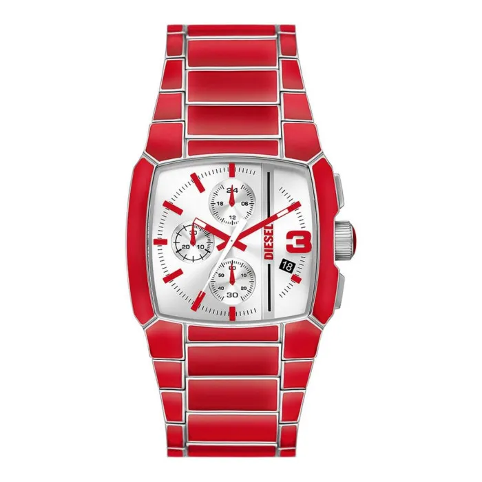 Introductie van de DieselĀ® Chronograph 'Cliffhanger' Herenhorloge DZ4637, waar robuust ontwerp samenkomt met supreme functionaliteit. Dit horloge belichaamt de geest van avontuur, perfect voor de man die zowel stijl als prestaties waardeert. Diesel, een baken in de wereld van mode en accessoires, heeft consequent gedurfde ontwerpen geleverd die conventionele esthetiek uitdagen. Met een unieke mix van straatgerichte stijl en geavanceerde ambachtelijkheid is Diesel de favoriete keuze geworden voor dynamische individuen die hun persoonlijkheid willen uitdrukken door middel van onderscheidende accessoires. Het Cliffhanger-model vangt deze ethos perfect, met een combinatie van duurzaamheid en een verfijnde uitstraling. De vierkante kast van roestvrij staal in verschillende kleuren valt niet alleen op, maar garandeert ook blijvende veerkracht, en houdt stand tegen de tucht van dagelijkse avonturen. Met een diameter van 40 mm biedt de kast een indrukwekkende aanwezigheid om de pols, terwijl de dikte van 11 mm een slank maar stevig profiel biedt. De opvallende zilveren wijzerplaat wordt beschermd door een mineraalglazen raam, dat ontworpen is om dagelijkse slijtage te weerstaan. Het horloge beschikt over chronograaf-functionaliteit en een datumkalender, waardoor het zowel praktisch als stijlvol is. De gedurfde rode band van roestvrij staal, met een lengte van 21 cm en een breedte van 28 mm, complementeert de opvallende kast en biedt een comfortabele pasvorm die is beveiligd met een vouwsluiting met drukknoop. Waterbestendig tot 5 bar, dit horloge is niet alleen een statement stuk, maar ook een betrouwbare partner voor elke activiteit, wat de toewijding van Diesel aan kwaliteit en moderne esthetiek samenvat.