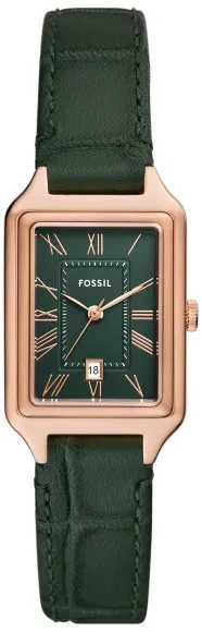 De Fossil® Analogue 'Raquel' Dameshorloge ES5366 is een schitterende aanvulling op de collectie van iedere vrouw. Dit dress watch combineert elegantie en functionaliteit op een perfecte manier. De opvallende rechthoekige kast in roségoud, met een afmeting van 30mm, is zowel duurzaam als stijlvol, met een strakke dikte van 7mm. Het mineralen glas beschermt de groene wijzerplaat die een praktische datumkalender bevat. Dit horloge is voorzien van een betrouwbare quartzbeweging, wat zorgt voor uitstekende precisie, zodat je altijd op tijd bent zonder concessies te doen aan stijl. De comfortabele groene leren band, met een lengte van 19cm en een breedte van 14mm, sluit veilig af met een betrouwbare gespsluiting. Met een waterbestendigheid van 5 bars is de Raquel ontworpen voor de dynamische vrouw die zowel schoonheid als functionaliteit in haar accessoires waardeert. Of je nu je outfit voor een speciale gelegenheid wilt aanvullen of je dagelijkse look wilt opfleuren, dit horloge voegt een chique touch toe aan elke outfit en belichaamt zowel professionaliteit als vrouwelijkheid. De Fossil® Raquel is meer dan een horloge; het is een stijlverklaring, perfect voor vrouwen die alle momenten willen laten tellen.