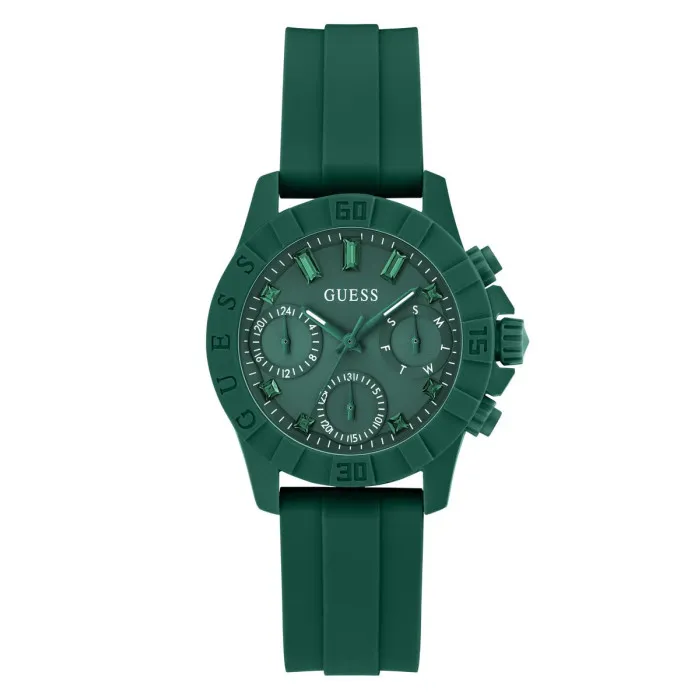 Stap binnen in de wereld van levendige elegantie met de Guess® Multi Dial 'Sportstar' Dameshorloge GW0775L3. Dit adembenemende sieraad is niet zomaar een horloge; het is een statement van stijl en functionaliteit. Perfect voor de moderne vrouw, dit horloge heeft een chique ronde kast gemaakt van duurzaam hars, wat zowel hedendaagse mode als blijvende kwaliteit uitstraalt. De betoverende groene tint van de horlogekast, met een diameter van 38 mm en een dikte van 12 mm, weerspiegelt een trendy en energieke geest, terwijl het mineraalglazen venster zorgt voor duurzaamheid en bescherming tegen dagelijkse slijtage. Het opvallende multi-dial ontwerp biedt niet alleen een stijlvolle esthetiek, maar ook de praktische mogelijkheid om meer dan alleen de tijd weer te geven. Wanneer je om je pols kijkt, combineert de levendige groene wijzerplaat functionaliteit met flair, waardoor het een perfect accessoire is voor elke outfit, of hij nu casual of gekleed is. Uitgerust met een dag-datum kalenderfunctie en een waterbestendigheids rating van 3 bar, is dit horloge perfect voor je actieve levensstijl zonder in te boeten op stijl. De groene siliconen band, die 19 cm lang en 18 mm breed is, omarmt je pols in comfort en biedt een verstelbare pasvorm die veilig wordt vastgezet met een betrouwbare gesp. Met een gewicht van slechts 40,8 gram voelt het Sportstar horloge licht maar duurzaam aan, waardoor het gemakkelijk de hele dag te dragen is. Omarm je avontuurlijke kant met een sieraad dat net zo gedurfd en prachtig is als jij. De Guess® Multi Dial 'Sportstar' Dameshorloge GW0775L3 gaat niet alleen over het bijhouden van de tijd; het gaat om het maken van tijdloze herinneringen.