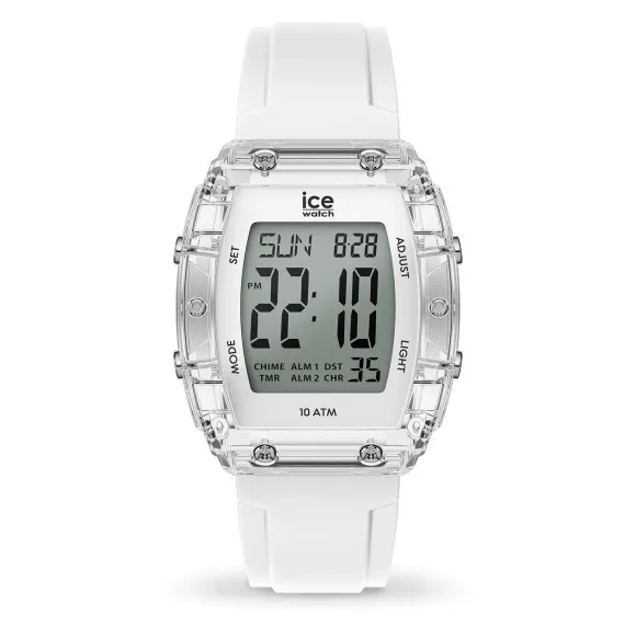 Maak kennis met de Ice Watch® Digital Ice Digit Boliday - Wit - Doorzichtig, een heerlijke creatie speciaal ontworpen voor de moderne vrouw. Deze horloge is meer dan alleen een accessoire; het is een uitdrukking van jouw levendige persoonlijkheid. Zorgvuldig ontworpen met een transparante resin kast, toont het een unieke tonneau-vorm die zowel stijlvol als comfortabel is. De onberispelijke witte siliconen band voegt niet alleen elegantie toe, maar garandeert ook duurzaamheid en gemak, waardoor het een perfecte aanvulling is op elke outfit, of het nu casual of formeel is. Het horloge heeft een opvallend LCD-display, waardoor je de tijd in één oogopslag kunt aflezen. Met een breedte van 37 mm en een lengte van 44 mm past het comfortabel op zelfs kleinere polsen, terwijl de bandlengte van 19 cm zorgt voor de perfecte pasvorm. Je zult de praktische dag-datum kalender waarderen, die een nuttige functie is voor het bijhouden van je drukke agenda. Het horloge is ook uitgerust met een scala aan spannende functionaliteiten, waaronder een stopwatch, countdown timer, alarm en licht, zodat je alles wat je nodig hebt direct om je pols hebt. Wanneer je dit horloge draagt, waardeer je niet alleen de elegantie die het aan je ensemble toevoegt, maar ook de betrouwbare quartzbeweging die precisie garandeert. Het is waterbestendig tot 10 bar, waardoor het geschikt is voor elke gelegenheid, van uitjes naar het strand tot dagelijks gebruik in elk weer. De Ice Digit Boliday is een belichaming van stijl, functionaliteit en comfort. Het is hier om je dagelijkse avonturen te verfraaien en je unieke geest te weerspiegelen. Koop Ice Watch® Digital 'Ice Digit Boliday - Wit - Doorzichtig' Dameshorloge (Klein) 024565 bij Ormoda