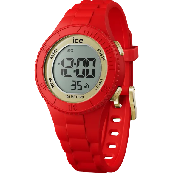 De Ice Watch® Digital 'Ice Digit - Rood Goud' Kinderwatch (Klein) 021620 is een heerlijke mix van plezier en functionaliteit, perfect voor de actieve jongeren in je leven. Ontworpen voor een unisex publiek, combineert deze watch een sportieve uitstraling met heldere kleuren die kinderen en adolescenten aanspreken. De levendige rode kast en siliconen band zorgen niet alleen voor een comfortabele pasvorm, maar maken het ook veerkrachtig genoeg om de energieke levensstijl van kinderen aan te kunnen. Met een kastdiameter van 34 mm is het klein genoeg voor delicate polsen, maar gedurfd genoeg om op te vallen. De ronde kast, vervaardigd uit duurzaam hars, toont een stijlvolle goudkleurige wijzerplaat die een vleugje elegantie toevoegt aan deze sportieve watch. Bovendien biedt het mineraalglas uitstekende bescherming en behoudt het de helderheid. Deze watch is uitgerust met een betrouwbare quartzbeweging, wat zorgt voor nauwkeurige tijdregistratie voor de kleine avonturiers die hun activiteiten willen bijhouden. Het digitale display is gemakkelijk te lezen, waardoor het functioneel en gebruiksvriendelijk is voor kinderen. Met een dag-datumkalender en waterbestendigheid tot 10 bar kan het gemakkelijk spatwater weerstaan. De watchband is verstelbaar, met een lengte van 19 cm en een breedte van 18 mm, en beschikt over een veilige gespsluiting voor een stevige pasvorm. Met een gewicht van slechts 28 gram is het licht en perfect voor dagelijks gebruik. De Ice Digit watch is een ideale keuze om jonge ontdekkingsreizigers te stimuleren de concepten van tijd en onafhankelijkheid te omarmen.