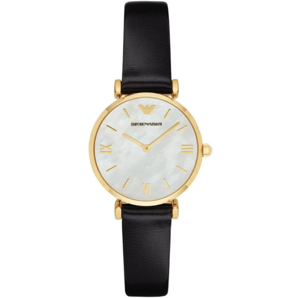 De Emporio Armani® Analogue 'Gianni T-bar' Dames Horloge AR1910 is een prachtige belichaming van elegantie en verfijning. Dit uitstekende horloge is ontworpen voor de moderne vrouw die zowel stijl als functionaliteit waardeert. Het horloge heeft een mooie ronde kast gemaakt van duurzaam roestvrij staal, prachtig afgewerkt in een luxueuze gouden kleur die de aandacht trekt. Met een kastdiameter van 32mm en een dikte van 8mm biedt het een comfortabele pasvorm terwijl het een statement maakt om de pols. De verbluffende parelmoer wijzerplaat biedt een unieke visuele diepte en een vleugje iriserend effect, wat een betoverende achtergrond creëert voor de slanke gouden wijzers en markeringen die leesbaarheid in één oogopslag garanderen. Voorzien van een betrouwbare quartz beweging, belooft dit horloge nauwkeurige tijdmeting voor jouw drukke levensstijl. Het glazen venster van mineraal beschermt de wijzerplaat, zodat deze krasvrij blijft terwijl jij je dagelijkse dingen doet. Aanvullend op de luxueuze kast is er een stijlvolle zwarte leren band, die niet alleen comfortabel is, maar ook een vleugje klassieke elegantie toevoegt. De band meet 19cm in lengte en 13mm in breedte, compleet met een veilige gesp die eenvoudige aanpassing mogelijk maakt. Met een waterbestendigheid van maximaal 3 bar kan dit horloge spetters en korte onderdompelingen weerstaan, waardoor het een praktische keuze is voor dagelijks gebruik. Het 'Gianni T-bar' horloge combineert hedendaags design met tijdloze charme, waardoor het een ideale accessoire is voor elke outfit, of deze nu casual of formeel is. Verhoog je accessoirecollectie met dit stuk van Emporio Armani, waar kunstzinnigheid samenkomt met functionaliteit voor de elegante vrouw.Koop Emporio Armani® Analogue 'Gianni T-bar' Dames Horloge bij Ormoda