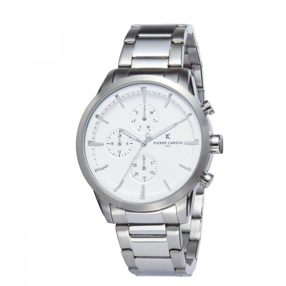 De Pierre Cardin® Multi Dial 'La Gloire Champeret' Herenhorloge PC902741F108 is een schitterende belichaming van verfijning en functionaliteit, ontworpen voor de moderne man die zowel stijl als nut waardeert. Deze horloge heeft een casual maar elegante uitstraling, waardoor hij geschikt is voor verschillende gelegenheden, of je nu op het werk bent, in je vrije tijd of op een sociale bijeenkomst. De robuuste constructie van roestvrij staal garandeert duurzaamheid en langdurig gebruik, terwijl de zilveren kast en band moeiteloos bij elke outfit passen. Deze horloge is uitgerust met een quartz-uurwerk, wat zorgt voor nauwkeurige tijdkeeping en betrouwbaarheid waarop je kunt rekenen. Met een diameter van 45 mm heeft de ronde horlogekast een opvallende aanwezigheid om de pols, terwijl de dikte van 11 mm het slank en comfortabel houdt voor dagelijks gebruik. De witte wijzerplaat fungeert als een perfect canvas voor de multi-dial display, die niet alleen de visuele aantrekkingskracht verhoogt, maar ook functionele veelzijdigheid toevoegt. Een geïntegreerde kalenderfunctie voor dag en datum helpt je om je planning op orde te houden. Het mineraalglas zorgt voor helderheid en bescherming, zodat de ingewikkelde details van de wijzerplaat behouden blijven, terwijl de vouwslot met drukknop zorgt voor een veilige pasvorm. Met een waterbestendigheid van 3 bar kan deze tijdpiece dagelijkse spetters weerstaan en meegaan met jouw dynamische levensstijl. Met een totaalgewicht van 152 gram biedt het de ideale balans tussen substantiële aanwezigheid en draagbaarheid, waardoor het de perfecte aanvulling op je horlogecollectie is.Koop Pierre Cardin® Multi Dial 'La Gloire Champeret' Herenhorloge PC902741F108 bij Ormoda