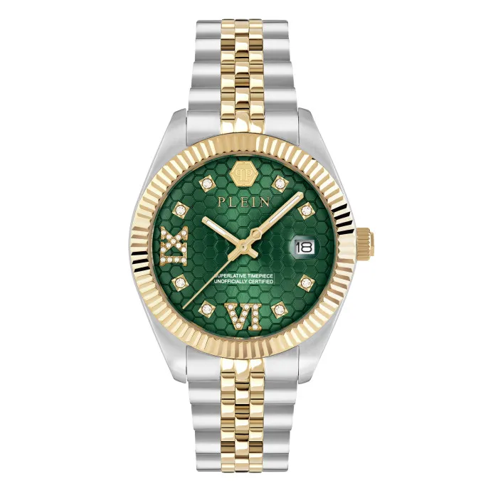 De prachtige Philipp PleinĀ® Analogue 'Date Superlative' Dameshorloge PWYFA0225 zuigt onmiddellijk de aandacht met zijn elegante en gedurfde ontwerp. Dit horloge, vervaardigd in een levendige multicolor ronde kast, heeft een opvallende groene wijzerplaat die niet alleen een gespreksonderwerp is, maar ook een verfrissende kleur aan elke outfit toevoegt. Met een betrouwbare quartz beweging garandeert het horloge nauwkeurige tijdwaarneming en voegt het een vleugje stijl toe aan je dagelijkse look. Met een kastdiameter van 34mm en een dikte van slechts 9mm, biedt het een perfecte balans tussen verfijndheid en draagcomfort. Dit schitterende horloge is gemaakt van duurzaam roestvrij staal, wat niet alleen zorgt voor een lange levensduur, maar ook een luxe gevoel biedt. De stijlvolle vouwsluiting biedt veiligheid zonder in te boeten op comfort, waardoor het ideaal is voor dagelijks gebruik. Met een bandlengte van 19 cm en een breedte van 18 mm, voegt de multicolor roeststalen band een extra laag van persoonlijkheid toe, waarmee je jouw unieke smaak kunt uitdrukken. Met een waterbestendigheid tot 5 ATM kan dit stukje luxe splashes en korte onderdompeling weerstaan, zodat je zelfs in onvoorspelbare omstandigheden stilistisch blijft. Dit horloge beschikt ook over een datumfunctie, zodat je georganiseerd en punctueel blijft. Perfect voor de moderne vrouw, weerspiegelt de 'Date Superlative' een chique en zelfverzekerde levensstijl, wat het een onmisbaar accessoire maakt voor naadloze overgangen van dag naar nacht.Koop Philipp PleinĀ® Analogue 'Date Superlative' Dameshorloge PWYFA0225 bij Ormoda