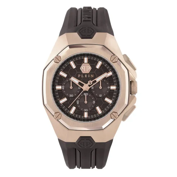 De Philipp Plein® Chronograaf 'Octagon' Herenhorloge PWTBA0223 belichaamt een opvallende mix van luxe en functionaliteit en vangt de essentie van moderne mannelijkheid. De prachtige rose goudstalen behuizing, met een diameter van 45mm en een dikte van 14mm, straalt verfijnde elegantie uit, perfect voor de man die durft op te vallen. Zijn ronde kast zorgt ervoor dat dit horloge een statement maakt om elke pols, terwijl de bruine siliconen band, van 21cm lang en 28mm breed, comfort en stijl garandeert voor een perfecte pasvorm bij elke gelegenheid. De wijzerplaat, in een rijke bruine tint en beschermd door duurzaam mineralen glas, biedt een chronografische weergave die functionaliteit combineert met een opvallende esthetiek. De luminescerende wijzers en cijfers zorgen voor een gemakkelijke leesbaarheid, zelfs bij weinig licht, waardoor dit horloge zowel praktisch als stijlvol is. Een indrukwekkende extra functie is de stopwatch, perfect voor het timen van je trainingen of het bijhouden van je dagelijkse planning. Waterbestendig tot 5 bar, is dit horloge gebouwd om de beproevingen van het dagelijks leven te doorstaan, waardoor het een ideale keuze is voor actieve individuen. Of je nu je kleeding wilt verfraaien voor een formele gelegenheid of casual wilt gaan tijdens een weekenduitje, de 'Octagon' belooft je outfit te verbeteren en een blijvende indruk achter te laten. Bij elke blik op je pols zul je het verfijnde ontwerp en de superieure ambachtelijkheid waarderen die synoniem zijn met het merk Philipp Plein.Koop Philipp Plein® Chronograaf 'Octagon' Herenhorloge PWTBA0223 bij Ormoda