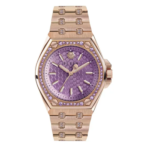 Duik in de adembenemende elegantie van de Philipp Plein® Analogue 'Plein Extreme Lady' Dameshorloge PWJAA0922. Speciaal ontworpen voor de moderne vrouw, spreekt dit prachtige tijdpiece boekdelen over stijl en verfijning. Met zijn ronde kast van rosegoud, gemaakt van roestvrij staal, met een diameter van 38mm en een dikte van 10mm, belichaamt het luxe in elk detail. De prachtige lila wijzerplaat vormt een perfecte aanvulling op de rosegouden setting, waardoor een harmonieuze balans ontstaat die aandacht trekt zonder opzichtig te zijn. Dit horloge beschikt over een duurzame mineralen glas wijzerplaat die het beschermt tegen krassen en de zichtbaarheid vergroot, zodat je bij verschillende gelegenheden op het horloge kunt vertrouwen. De stenen bezettingen op de horlogekast voegen een extra vleugje glamour toe, waardoor het ideaal is voor zowel casual uitjes als formele evenementen. De luxueuze rosegouden roeststalen band, die 19cm lang en 23mm breed is, voelt comfortabel aan de pols en benadrukt de algehele elegantie die Philipp Plein belichaamt. De deployment clasp zorgt voor een veilige pasvorm en maakt het gemakkelijk om het horloge aan en uit te doen. Aangedreven door een betrouwbare quartz beweging, biedt dit horloge precisie en prestaties, zodat je met vertrouwen je tijd kunt bijhouden. Het is ook waterbestendig tot 5 bar, waardoor het geschikt is voor dagelijks gebruik zonder zorgen. Omarm de aantrekkingskracht van verfijning en maak een statement met dit fascinerende stuk dat perfect samengaat met jouw stijl.