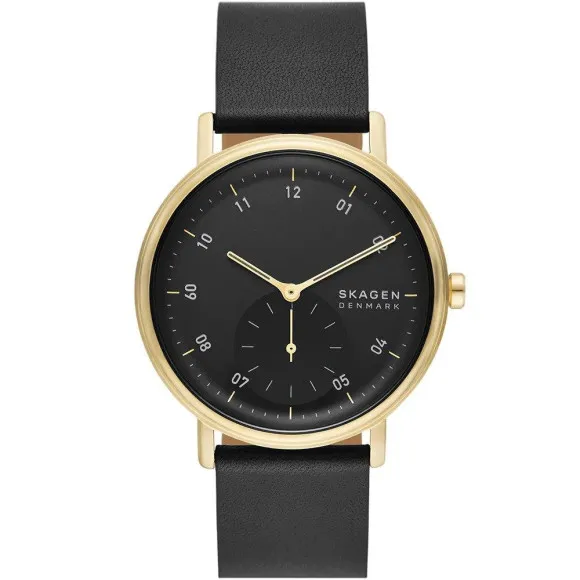 Het SkagenĀ® Analogue 'Kuppel' Herenhorloge SKW6896 belichaamt moeiteloos verfijning en moderne stijl. Dit uurwerk is een bewijs van Skagens toewijding aan innovatieve ontwerpen en beschikt over een schitterende gouden roestvrijstalen kast die luxe uitstr straalt, maar ook veelzijdig genoeg is voor dagelijks gebruik. Met een diameter van 44 mm biedt deze ronde horlogekast een gedurfde uitstraling om de pols, terwijl de slanke 8 mm dikte zorgt voor een gestroomlijnd profiel. De zwarte wijzerplaat contrasteert prachtig met de warme tint van de kast en biedt een tijdloze esthetiek die geschikt is voor elke formele gelegenheid. Aangedreven door betrouwbare kwartsbeweging, zorgt het Kuppel-horloge voor nauwkeurige tijdmeting, wat een kenmerk is van Skagens toewijding aan functionaliteit. Het mineraalglazen wijzerplaatvenster beschermt het horloge, biedt duurzaamheid en toont het elegante ontwerp. Met een comfortabele zwarte leren band van 21 cm lang en 22 mm breed, ziet dit horloge er niet alleen goed uit, het voelt ook goed aan om te dragen. De klassieke gesp sluiting zorgt voor een veilige pasvorm, wat de praktische aard van het horloge verder versterkt. Met een waterbestendigheid tot 3 bar is de Kuppel niet alleen stijlvol, maar ook ontworpen om de uitdagingen van alledag aan te kunnen. Dit horloge is gemaakt voor mannen die een combinatie van moderne esthetiek en klassieke vormen waarderen, waardoor het een prachtige aanvulling is op elke garderobe. Of je nu op een zakelijke vergadering bent of een casual uitje hebt, het Skagen Kuppel-horloge straalt vertrouwen en verfijnde stijl uit zonder in te boeten op comfort of functionaliteit. Omarm elegantie en precisie met dit voortreffelijke uurwerk dat de essentie van Skagens vakmanschap en esthetisch vermogen belichaamt.Koop SkagenĀ® Analogue 'Kuppel' Herenhorloge bij Ormoda