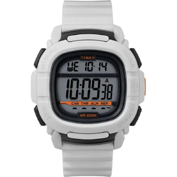 De Timex® Digital 'Command' Herenhorloge TW5M26400 is de belichaming van veelzijdigheid voor de moderne man. Ontworpen met een sportieve flair, belichaamt dit horloge een perfecte mix van functionaliteit en stijl. De witte kunststof kast heeft een robuuste diameter van 45mm en een dikte van 15mm, waardoor het duurzaam is en toch een lichtgewicht gevoel heeft van slechts 80 gram. De ronde vorm bevordert de leesbaarheid van de LCD-dial, die niet alleen de tijd toont, maar ook de dag en datum voor efficiënte planning. Het mineraalglas glas is krasbestendig, wat de levensduur vergroot. Dit horloge is voorzien van een quartz beweging die zorgt voor een nauwkeurige tijdsaanduiding. Het biedt ook praktische functies zoals een stopwatch, timer, alarm en de innovatieve Indiglo-verlichting voor gemakkelijke afleesbaarheid in omstandigheden met weinig licht. Met een waterbestendigheid van tot 20 bar, blinkt de Digital 'Command' uit in elke omgeving, waardoor hij ideaal is voor zowel avontuur als ontspanning. De siliconen band van 21 cm lang en 21 mm breed is zowel comfortabel als stijlvol, en is bevestigd met een betrouwbare buckle clasp die zorgt voor een stevige pasvorm voor elke pols. Of je nu in de sportschool bent of in de natuur, dit horloge weerstaat de uitdaging en vertegenwoordigt een verstandige investering voor degenen die waarde hechten aan kwaliteit en prestaties.