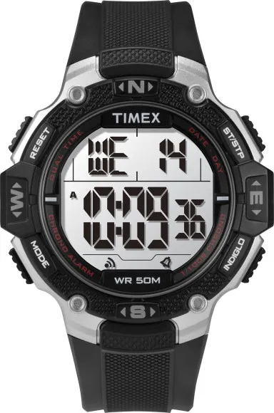 Ontdek de Timex® Digital 'Dgtl' Herenhorloge TW5M41200, waar robuuste militaire stijl samenkomt met moderne technologie. Dit horloge is ontworpen voor mannen die precisie en functionaliteit waarderen. De duurzame kunststof kast met een opvallende zilveren afwerking herbergt een gemakkelijk afleesbaar LCD-display, waardoor het horloge onder alle omstandigheden goed leesbaar is. Met een kastdiameter van 42 mm en een dikte van 15 mm, biedt dit horloge de perfecte balans tussen gedurfd en elegant, waardoor het geschikt is voor zowel dagelijks gebruik als avontuurlijke uitjes. De zwarte kunststof band, met een lengte van 21 cm en een breedte van 20 mm, is ontworpen voor comfort en duurzaamheid en zorgt voor een veilige pasvorm in zowel actieve situaties als ontspannen momenten. De gesp sluiting zorgt voor snelle bevestiging en maakt eenvoudige aanpassingen mogelijk indien nodig. Dit digitale horloge is meer dan alleen stijl; het is ontworpen voor veelzijdigheid met een scala aan functies. Van een nauwkeurige kwartsbeweging tot de functionaliteit van een stopwatch, duale tijdsaanduiding en alarm, dit horloge zal een essentieel onderdeel van je dagelijkse routine worden. Het is uitgerust met Timex’s kenmerkende Indiglo-verlichting voor eenvoudig aflezen in omstandigheden met weinig licht, wat bewijst dat praktische bruikbaarheid en stijl hand in hand kunnen gaan. Met een waterbestendigheidsklasse van 5 bar biedt dit horloge de gemoedsrust dat het bestand is tegen spetters en korte onderdompeling in water. De Timex® Digital 'Dgtl' is een statement stuk dat mode en functionaliteit samenbrengt, speciaal gemaakt voor degenen die een actief leven leiden. Het is niet zomaar een horloge; het is jouw betrouwbare metgezel, waar je ook naartoe gaat.