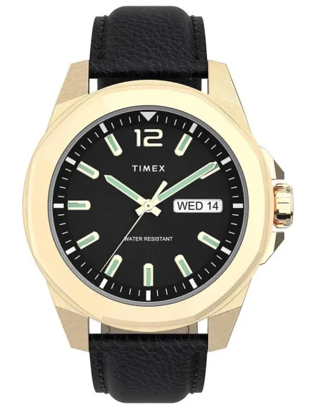 Met de Timex® Analogue 'Essex Avenue' Herenhorloge TW2U82100 draait alles om de perfecte combinatie van klassieke stijl en moderne functionaliteit. Dit horloge, speciaal ontworpen voor de hedendaagse gentleman, is een echte blikvanger met zijn gedurfde gouden kast en opvallende zwarte wijzerplaat, wat zorgt voor een dynamisch en aantrekkelijk geheel. De kast van 46 mm van messing is stevig en tegelijk stijlvol, waardoor het horloge duurzaam is zonder in te boeten op elegantie. Met een dikte van slechts 12 mm ligt het comfortabel om de pols en is het perfect voor zowel informele uitjes als meer formele gebeurtenissen. De wijzerplaat heeft een dag-date kalenderfunctie, waardoor je de praktische voordelen in je dagelijkse routine kan combineren met een verfijnde uitstraling. Het mineraalglas beschermt de wijzerplaat en zorgt ervoor dat deze krasvrij en onberispelijk blijft, zelfs bij regelmatig gebruik. Dit horloge wordt aangedreven door een betrouwbare quartz beweging, die garant staat voor nauwkeurige tijdswaarneming die je niet in de steek laat. De luxe gouden kast wordt aangevuld met een zwart leren band van 21 mm breed, wat tijdloze stijl uitstraalt. De gesp sluiting zorgt voor een gemakkelijke en veilige pasvorm voor polsen tot 21 cm. Het horloge is ontworpen om waterdicht te zijn tot 5 bar, zodat je het met vertrouwen kunt dragen in verschillende omstandigheden, of het nu een dag op kantoor is of een avondje uit. Met een hoogte van 54 mm tussen de lugs presenteert de 'Essex Avenue' een look die gedurfd en zelfverzekerd is. Dit tijdsdocument is niet alleen een horloge, maar ook een weerspiegeling van een levensstijl, waardoor het een essentieel onderdeel is van de collectie van elke man.