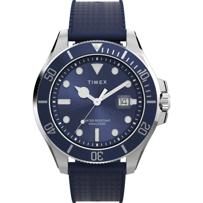 De Timex® Analogue 'Harborside Coast' Herenhorloge TW2Y05000 belichaamt een geest van avontuur en verfijning die aanspreekt bij de moderne man. Dit uitzonderlijke uurwerk toont een opvallende blauwe wijzerplaat die zelfvertrouwen uitstraalt, prachtig aangevuld door een slanke zilveren kast van messing. Ontworpen voor de actieve levensstijl, heeft het horloge een ronde kast met een diameter van 43mm en een dikte van 11mm, wat het zowel visueel aantrekkelijk als comfortabel maakt om te dragen. De draaibare bezel geeft een functionele meerwaarde, zodat je gemakkelijk je dagelijkse plannen kunt navigeren. Uitgerust met een duurzame kwartsbeweging, garandeert de Harborside Coast nauwkeurige tijdsregistratie, waardoor het een ideale metgezel is, zowel in professionele als in informele omgevingen. Het hoogwaardige mineraal glas van de wijzerplaat verhoogt de duurzaamheid en biedt een helder zicht op de tijd. De levendige blauwe rubberen band, met een lengte van 21cm en een breedte van 19mm, is voorzien van een veilige gespsluiting die zorgt voor een stevige pasvorm om je pols. Met een waterbestendigheid van tot 10 bar kun je dit horloge met vertrouwen dragen, of je nu zwemt of in de regen terechtkomt. Bovendien voegt de datumschaal praktische gebruiksgemak toe aan je dagelijkse activiteiten, zodat je altijd op schema bent. Voor de man die een combinatie van stijl en functionaliteit waardeert, is de Timex® Analogue 'Harborside Coast' Herenhorloge TW2Y05000 een opmerkelijke keuze.