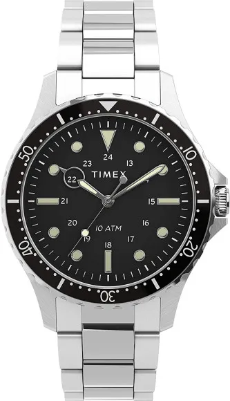 De Timex® Analogue 'Navi' Herenhorloge TW2U10800 is een waar statementstuk, ontworpen voor de avontuurlijke geest. Deze duikhorloge combineert precisie en stijl en belichaamt de essentie van functionaliteit en elegantie. De stevige behuizing van roestvrij staal, met een diameter van 41 mm en een dikte van 12 mm, garandeert duurzaamheid die geschikt is voor zowel onderwaterverkenningen als dagelijks gebruik. De draaibare bezel voegt een praktische functie toe, waarmee je eenvoudig de duiktijd kunt bijhouden, terwijl het een gedurfde esthetische verklaring op je pols maakt. De opvallende zwarte wijzerplaat trekt je aandacht met zijn strakke, klassieke uitstraling, beschermd door mineraalglas dat bestand is tegen de eisen van je actieve levensstijl. De analoge display presenteert de tijd helder, met een contrast dat het gemakkelijk maakt om in alle lichtomstandigheden af te lezen. Je kunt zonder zorgen deze horloge dragen, wetende dat het is ontworpen om druk tot 10 bar te weerstaan, waardoor het een ideale metgezel is voor wateravonturen of dagelijkse activiteiten. Ter aanvulling op het slanke ontwerp, verbetert de zilverkleurige roestvrijstalen band zowel comfort als stijl. Met een lengte van 21 cm en een breedte van 19 mm is het voorzien van een vouwsluiting met een drukknoop voor een veilige bevestiging. De afstand van 50 mm van lug tot lug draagt bij aan de draagbaarheid, wat ervoor zorgt dat het elegant om de meeste polsen past. Met een gewicht van slechts 146 gram voelt het licht en onopvallend aan, perfect voor dagelijks gebruik. Betrouwbare quartzbeweging houdt je punctueel en voorbereid voor elke gelegenheid. Dit horloge is niet alleen een accessoire, maar een betrouwbare tool voor degenen die gedreven worden door verkenning en ontdekking.