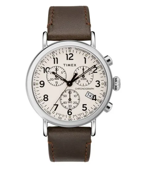 Maak kennis met de Timex® Chronograph 'Standard Chrono' Herenhorloge TW2T21000, een horloge dat praktische elegantie en sportieve functionaliteit perfect combineert. Ontworpen voor de moderne man, heeft dit tijdpiece een opvallende beige wijzerplaat, omringd door een ronde messing kast in een verfijnde zilverkleur. Het mineraalglas beschermt de eenvoud en helderheid van de chronograafweergave, zodat je altijd op tijd bent, zowel tijdens werk als ontspanning. Dit op quartz aangedreven horloge heeft een robuuste kast met een diameter van 41 mm en een dikte van 11 mm, waardoor een juiste balans tussen duurzaamheid en comfort wordt gevonden. Dankzij de kalenderfunctie kun je georganiseerd en punctueel blijven. De bruine leren band, met een lengte van 21 cm en een breedte van 18 mm, biedt een klassieke maar hedendaagse uitstraling, die stevig wordt vastgemaakt met een betrouwbare gesp. Met een waterdichtheid van 3 bar is het bestand tegen af en toe opspattend water, waardoor het je ideale metgezel is voor zowel casual uitjes als sportieve activiteiten. De Timex 'Standard Chrono' is bij uitstek geschikt voor mannen die functioneel ontwerp waarderen zonder in te boeten op stijl. Dit horloge kan moeiteloos van een dag op kantoor naar een avond met vrienden gaan. Met de perfecte balans tussen prestaties en esthetiek, zal het snel je go-to accessoire worden. Ervaar de betrouwbaarheid en vakmanschap waar Timex om bekend staat en geef je pols een horloge dat een verhaal van avontuur en verfijning vertelt. Verhoog je dagelijkse look met dit uitzonderlijke tijdpiece.