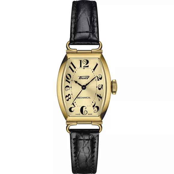 De tissot heritage porto small lady t1281613626200 voor dames is uitgerust met een handopwinder uurwerk en een 22mm rvs kast. De goudkleurig wijzerplaat is gehuisvest in een goudkleurig gekleurde kast en een zwart leer band. Het horloge wordt geleverd in een originele doos en heeft een garantie van 2 jaar.