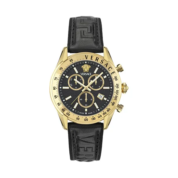 De VersaceĀ® Chronograph 'Chrono Master' Mannenhorloge VE8R00224 is een adembenemend stuk dat luxe en functionaliteit perfect samenbrengt, speciaal ontworpen voor de moderne man. Dit horloge toont een verfijnd esthetisch ontwerp, benadrukt door de gewaagde gouden roestvrijstalen kast met een diameter van 44 mm. Het horloge heeft een opvallende zwarte wijzerplaat die wordt beschermd door saffierglas, wat zorgt voor duurzaamheid en helderheid. Met een quartz beweging en chronografische weergave houdt dit horloge niet alleen de tijd perfect bij, maar biedt het ook stopwatchfunctionaliteit, waardoor het een praktische aanvulling is voor elke garderobe. Ontworpen voor dagelijks gebruik, wordt de casual stijl van dit horloge verhoogd door de luxe zwarte lederen band, die 21 cm lang en 21 mm breed is. De gesp sluit het horloge comfortabel om de pols, terwijl de lichtgevende wijzers en cijfers het gemakkelijk maken om te lezen, zelfs bij weinig licht. Waterbestendig tot 5 bar, de Chrono Master is geschikt voor verschillende activiteiten, niet alleen voor formele gelegenheden. De tachymeterfunctie voegt een sportieve uitstraling toe, waardoor snelle snelheidscalculaties mogelijk zijn, ideaal voor de man die altijd onderweg is. Dit opmerkelijke horloge belichaamt de kern van Versace's toewijding aan kwaliteit en precisie, wat het een uitstekende keuze maakt voor degenen die fijne ambacht en stijlvol design waarderen.