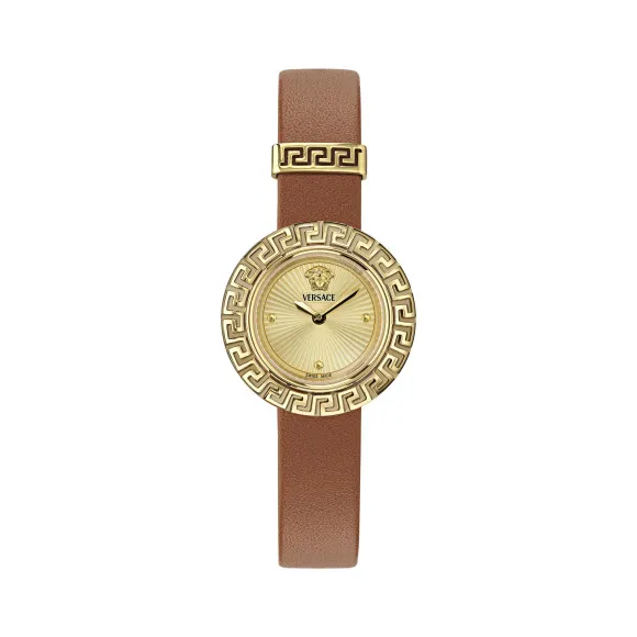 De Versace® Analogue 'La Greca' Dameshorloge VE8C00124 is een betoverende samensmelting van elegantie en moderniteit, ontworpen om de verfijnde aard van vrouwen die van luxe houden te accentueren. Gefabriceerd van duurzaam roestvrij staal, toont de prachtige ronde kast een glanzende gouden afwerking, die perfect aansluit bij de betoverende gouden wijzerplaat. Dit horloge belichaamt het essentiële dresshorloge en biedt een chique en tijdloze uitstraling die moeiteloos overgaat van formele bijeenkomsten naar casual uitjes. Het saffierglas venster voegt een extra laag van verfijning en bescherming toe, waardoor uw horloge krasbestendig blijft terwijl het een lumineuze aantrekkingskracht uitstraalt. Met een comfortabele leren band in een zachte bruine tint, wikkelt dit horloge zich elegant om de pols, en biedt zowel stijl als comfort voor de hele dag. De royale lengte van 19 cm in combinatie met een breedte van 12 mm zorgt voor een veilige pasvorm, waardoor het een perfecte aanvulling is op elke sieradencollectie. De verstelbare gesp vergemakkelijkt het dragen en voegt ook een vleugje verfijnde stijl toe, waardoor dit horloge zich onderscheidt van anderen. Onder het oppervlak garandeert de betrouwbare quartzbeweging precisie, waardoor de tijd met de grootste nauwkeurigheid wordt bijgehouden. Ontworpen om de ontberingen van het dagelijks leven te weerstaan, is de constructie geschikt voor een waterweerstand tot 3 bar, en belooft duurzaamheid in elke situatie. De Versace 'La Greca' horloge is niet zomaar een accessoire; het is een statement. Het sieren van uw pols met dit opmerkelijke stuk geeft blijk van een voorliefde voor de fijnere dingen in het leven, en biedt u het vertrouwen om elke gelegenheid met flair en verfijning te omarmen.Koop Versace® Analogue 'La Greca' Dameshorloge bij Ormoda
