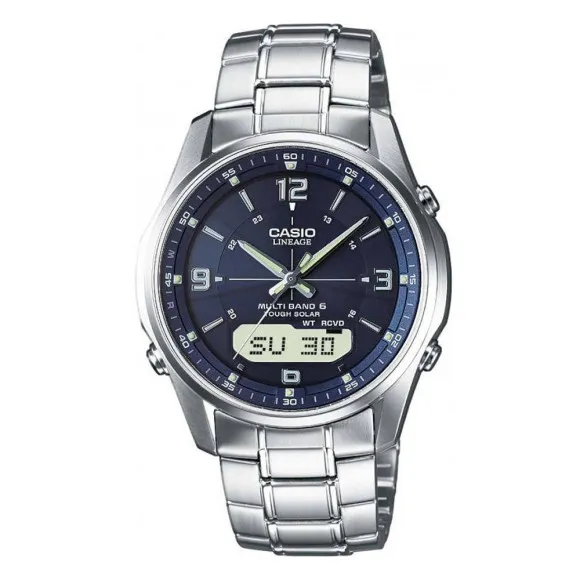 The Casio® Analogue-digital 'Collection' Men's Watch LCW-M100DSE-2AER is a testament to the perfect blend of style and functionality. This remarkable timepiece features a striking blue dial, elegantly encased in a round stainless steel casing with a refined silver finish. At 40mm in diameter and only 9mm thick, this watch offers a sleek profile that suits any occasion, whether casual or formal. The sturdy sapphire glass protects the dial from scratches, ensuring your watch retains its sparkling clarity. One of the standout features of this timepiece is its innovative solar-powered movement. Harnessing the power of light, this watch eliminates the hassle of battery replacements, providing you with a constant companion that’s both reliable and sustainable. Its advanced radio-controlled functionality ensures that you're always on time, adjusting automatically to your time zone with impeccable accuracy. The watch also incorporates world time, stopwatch, and timer capabilities, making it the ideal choice for the modern man who values precision and convenience. The silver stainless steel band, with a length of 21cm and width of 18mm, is both robust and stylish, equipped with a fold-over clasp that adds to its comfort and adaptability. With an ATM rating of 5 bars, this timepiece is not only stylish but also practical for everyday wear. Whether you're heading to a business meeting or enjoying a weekend getaway, the Casio® Analogue-digital 'Collection' Men's Watch will seamlessly fit into any lifestyle. The day-date calendar feature adds an extra layer of functionality, allowing easy tracking of your schedule. This watch is an ideal choice for men who appreciate elegance blended with innovation.Shop Casio LCW-M100DSE-2AER at Ormoda