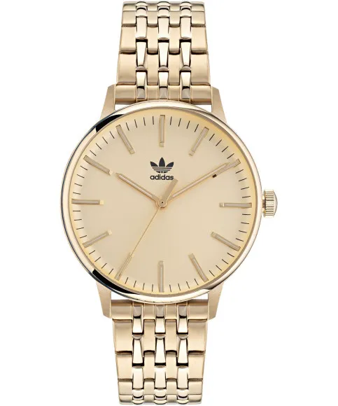 Präsentiert wird die Adidas Originals® Analogue 'Code One' Unisex Uhr AOSY22024, bei der funktionales Handwerk auf zeitgenössischen Stil trifft. Dieses elegante Zeitmesser, perfekt für Männer und Frauen, verkörpert die Essenz des athletischen Luxus. Entworfen von der renommierten Marke Adidas Originals, fängt es den Geist urbaner Mode ein und sorgt dafür, dass jedes Detail durchdacht für optimalen Komfort und Leistung ist. Mit einem reichen Erbe in der Sportkultur setzt Adidas Originals weiterhin Maßstäbe in Fashion und Funktionalität, und diese Uhr ist da keine Ausnahme. Die Uhr verfügt über ein stilvolles analoges Zifferblatt mit einem auffälligen goldenen Zifferblatt, das perfekt zu einem strapazierfähigen Edelstahlgehäuse passt. Mit einem Durchmesser von 38 mm und einer Dicke von nur 8 mm ermöglicht das runde Gehäusedesign ein müheloses Tragen am Handgelenk, während die goldene Farbe deinem Alltagsoutfit einen Hauch von Eleganz verleiht. Das robuste Mineralglas schützt vor Kratzern und gewährleistet eine klare Sicht auf die Zeit, während die Klappschließe mit Druckknopf sie während all deiner Aktivitäten sicher hält. Das goldene Edelstahlband misst 20 cm in der Länge und 19 mm in der Breite und schmiegt sich angenehm um das Handgelenk, was es zu einem idealen Accessoire für legere oder schickere Looks macht. Mit einer Wasserbeständigkeit von bis zu 5 bar ist dieses Zeitmesser nicht nur stylisch, sondern auch praktisch, sodass du es in jeder Situation mit Zuversicht tragen kannst. Jeder Aspekt der Adidas Originals 'Code One' Uhr wurde mit sowohl Ästhetik als auch Funktionalität im Hinterkopf gestaltet. Sie lädt dich ein, in deinem Alltag ein Statement zu setzen und gleichzeitig die Zuverlässigkeit eines Quarzwerks zu genießen. Diese Uhr ist mehr als nur ein Zeitmesser; sie ist eine Feier deines Stils und ein wesentlicher Bestandteil deines Modearsenals. Shop Adidas Originals® Analogue 'Code One' Unisex Uhr bei Ormoda