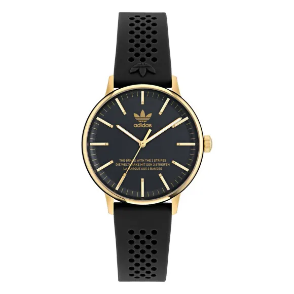 Erleben Sie das Wesen moderner Eleganz mit der Adidas Originals® Analogue 'Code One' Unisex-Uhr AOSY23524. Dieses atemberaubende Zeitmesser vereint lässige Eleganz und funktionales Design auf perfekte Weise. Sie ist für jene entworfen, die Stil und Komfort schätzen, ob im Alltag oder zu besonderen Anlässen. Das goldfarbene Edelstahlgehäuse umschließt ein auffälliges schwarzes Zifferblatt und bietet einen kräftigen Kontrast, der die Aufmerksamkeit auf sich zieht und gleichzeitig die Lesbarkeit sicherstellt. Mit einem Durchmesser von 38 mm ist das runde Gehäuse nur 8 mm dick, was es leicht und angenehm macht, die Uhr den ganzen Tag am Handgelenk zu tragen. Angetrieben von einem zuverlässigen Quarzwerk garantiert diese Uhr eine präzise Zeitmessung. Das analoge Zifferblatt wird durch robustes Mineralglas geschützt, welches Kratzer widersteht und Klarheit bietet. Diese Uhr verfügt über ein elegantes schwarzes Silikonarmband, das 20 cm lang und 17 mm breit ist. Es sieht nicht nur sportlich aus, sondern fühlt sich auch weich auf der Haut an. Diese Uhr ist für einen Wasserwiderstand von bis zu 5 bar ausgelegt, was sie für Schwimmen und den täglichen Gebrauch geeignet macht. Der Schnallenverschluss sorgt für einen sicheren Sitz, sodass Sie diese Uhr mühelos stylen können, egal ob Sie zu einem lässigen Ausflug oder einem formelleren Treffen aufbrechen. Mit der Adidas Originals® Analogue 'Code One' Uhr tragen Sie nicht nur die Zeit; Sie setzen ein Statement.Shop Adidas Originals® Analogue 'Code One' Unisex-Uhr AOSY23524 bei Ormoda