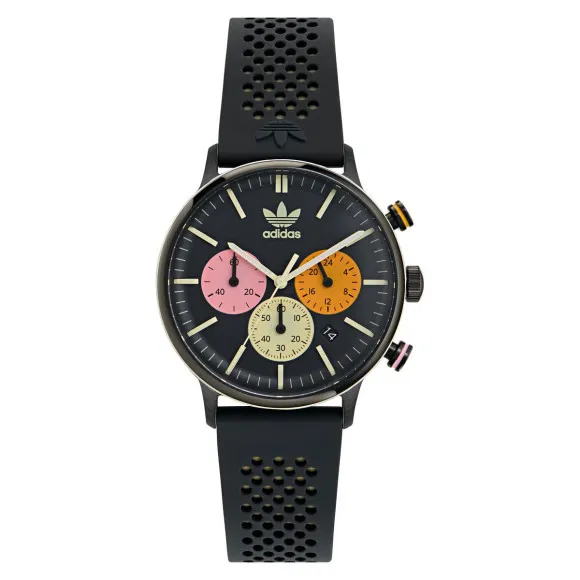 Erleben Sie das dynamische Aussehen und die überlegene Leistung der Adidas Originals® Chronograph 'Code One Chrono' Unisex-Uhr AOSY24084. Dieses bemerkenswerte Zeitstück wurde für Menschen entwickelt, die das Leben in Bewegung genießen und sowohl Funktionalität als auch Stil zu schätzen wissen. Die Uhr verfügt über ein robustes gehärtetes Gehäuse aus schwarzem Edelstahl, das ihre sportlichen Ästhetik verstärkt und gleichzeitig Langlebigkeit gewährleistet. Sie besitzt ein 40 mm großes, rundes Zifferblatt, das mit lebhaften, mehrfarbigen Details verziert ist, die sie nicht nur zu einer Uhr, sondern auch zu einem modischen Statement machen. Das Mineralglas bietet Klarheit und Kratzfestigkeit und schützt das feine Design darunter. Das Quarzwerk sorgt für präzise Zeitmessung, während das Chronographen-Display Praktikabilität für diejenigen bietet, die Zeitintervalle während des Trainings oder im Alltag verfolgen möchten. Die Datumsanzeige eliminiert die Mühe, den Tag manuell nachzuhalten. Zum zusätzlichen Komfort ist das Silikonband sowohl leicht als auch flexibel und hat eine Länge von 20 cm sowie eine Breite von 18 mm, um einen sicheren Sitz am Handgelenk zu gewährleisten. Die Uhr wurde für einen aktiven Lebensstil entwickelt und bietet eine Wasserbeständigkeit von 5 Bar, wodurch sie für Spritzer und kurze Tauchgänge geeignet ist. Mit einer Gehäusehöhe von 10 mm und einer Lug-to-Lug-Höhe von 46 mm bietet diese Unisex-Uhr die perfekte Balance zwischen einer sportlichen Uhr und einem schicken Accessoire. Mit nur 59 Gramm fühlt sie sich leicht am Handgelenk an, sodass Sie sich auf Ihre Aktivitäten konzentrieren können, ohne Ablenkungen. Ob im Fitnessstudio oder beim Ausgehen, die Adidas Originals® Chronograph 'Code One Chrono' Unisex-Uhr passt elegant zu allen Anlässen. Shop Adidas Originals® Chronograph 'Code One Chrono' Unisex-Uhr AOSY24084 bei Ormoda