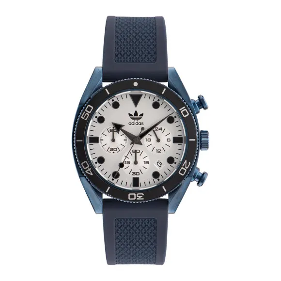 Die Adidas Originals® Chronograph 'Edition Two Chrono' Unisex-Uhr AOFH23004 verkörpert den dynamischen Geist eines aktiven Lebensstils. Diese Uhr wurde für diejenigen entwickelt, die sowohl Stil als auch Funktionalität schätzen und ist der ideale Begleiter für sportliche und lässige Anlässe. Das atemberaubende blaue Gehäuse aus hochwertigem Edelstahl bietet Langlebigkeit und eine auffällige visuelle Anziehungskraft. Das runde Gehäuse mit einem Durchmesser von 43 mm und einer Dicke von 12 mm sitzt bequem am Handgelenk, während die 10-bar Wasserbeständigkeit bedeutet, dass du sie mit Zuversicht tragen kannst, egal ob bei Regen oder Sonnenschein. Unter dem schimmernden silbernen Zifferblatt verbirgt sich ein Zeitmesser, der durch ein zuverlässiges Quarzwerk angetrieben wird, welches Präzision in jedem Tick gewährleistet. Die Chronographenanzeige bietet nicht nur die Standardzeit, sondern auch die zusätzliche Funktion zur Messung der verstrichenen Zeit, was Fitnessbegeisterte und aktive Menschen anspricht. Die Datumsfunktion ist eine praktische Ergänzung für den Alltag. Eingekapselt in widerstandsfähigem Mineralglas bietet das Zifferblatt Schutz vor Kratzern und einen klaren Blick auf die Zeit. Gestaltet für einen unisex Appeal besteht das lebendige blaue Silikonband aus einer komfortablen Länge von 20 cm und einer Breite von 21 mm, gesichert mit einer zuverlässigen Schnallenverschluss. Die drehbare Lünette erhöht die Funktionalität der Uhr und trägt zu ihrer sportlichen Ästhetik bei. Mit einem Gewicht von nur 92 Gramm ist sie leicht genug für den ganztägigen Gebrauch. Mit einer Gesamtlughöhe von 49 mm ist sie perfekt proportioniert, um verschiedenen Handgelenkgrößen gerecht zu werden. Die Adidas Originals® Chronograph 'Edition Two Chrono' ist mehr als nur eine Uhr; sie ist ein Lebensstil-Statement.Shop Adidas Originals® Chronograph 'Edition Two Chrono' Unisex-Uhr AOFH23004 bei Ormoda