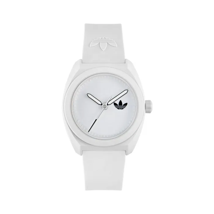 Die Adidas Originals® Analogue 'Project Three' Unisex-Uhr AOST24548 ist ein Zeitmesser, der den sportlichen Geist mit modernem Design verbindet. Adidas Originals, bekannt für sein Engagement für leistungsstarke und stilvolle Produkte, hat es verstanden, diese vielseitige Uhr zu kreieren, die nahtlos sowohl in den Alltag als auch in aktive Lebensstile passt. Eine Uhr dieser Marke zu tragen, bedeutet nicht nur, die Zeit im Auge zu behalten; es geht auch darum, einen Lebensstil zu verkörpern, der in Sport und Individualität verwurzelt ist. Dieses elegante Stück spiegelt die innovative Ästhetik wider, die Fans der Marke schätzen, und ist für jeden geeignet, der Qualität und Trendbewusstsein wertschätzt. Die Uhr verfügt über ein robustes Quarzwerk, das eine präzise Zeitmessung gewährleistet. Das runde Gehäuse hat einen Durchmesser von 42 mm und eine Dicke von 11 mm. Es besteht aus strapazierfähiger Keramik, die ihm ein modernes und schlankes Aussehen verleiht. Das beeindruckende weiße Gehäuse wird durch ein passendes weißes Zifferblatt ergänzt, das einen frischen und klaren Look bietet. Das Zifferblatt ist durch Mineralglas geschützt, was Haltbarkeit und Kratzfestigkeit gewährleistet. Darüber hinaus ist die Uhr mit einer Wasserdichtigkeit von bis zu 5 Bar ausgestattet, was sie für den täglichen Gebrauch geeignet macht. Das ebenfalls weiße Armband besteht aus Kunststoff und bietet sowohl Komfort als auch Flexibilität für verschiedene Aktivitäten. Mit einer Länge von 20 cm und einer Breite von 20 mm verfügt das Armband über eine sichere Schnallenschließe, die eine perfekte Passform für jedes Handgelenk gewährleistet. Das Gesamtgewicht der Uhr beträgt leichte 47 g, was sie bequem macht, um sie den ganzen Tag über zu tragen. Mit ihrer Kombination aus Stil und Funktionalität ist die Adidas Originals® Analogue 'Project Three' Uhr ein Must-have-Accessoire für jeden, der seine Alltagsoutfits aufwerten möchte. Shop Adidas Originals® Analogue 'Project Three' Unisex-Uhr AOST24548 bei Ormoda