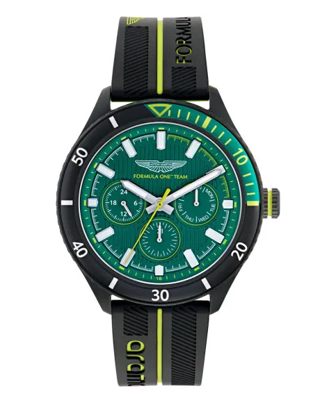 Die Aston Martin® Multi Dial 'Am Formula 1 Pit W' Herrenuhr MTFP1F503 ist der Inbegriff von Eleganz und Leistung und spiegelt das reiche Erbe der Marke im Rennsport und im Luxus wider. Mit einem gewagten Design, das ein auffälliges Gehäuse aus schwarzem Harz integriert, ist diese Uhr für den modernen Mann konzipiert, der sowohl Stil als auch Funktionalität schätzt. Die Uhr verfügt über ein robustes rundes Gehäuse mit einem Durchmesser von 46 mm, das eine markante Präsenz am Handgelenk ermöglicht und gleichzeitig mit einer sorgfältig durchdachten Dicke von 11,8 mm für Komfort sorgt. Das Quarzwerk garantiert zuverlässiges Zeitmanagement, was diese Uhr zu einem verlässlichen Begleiter macht, egal ob im Büro oder auf der Rennstrecke. Das auffällige schwarze Zifferblatt wird von einem Mineralglasfenster ergänzt, das sowohl Klarheit als auch Langlebigkeit bietet. Die Multi-Dial-Funktionalität hält Sie informiert, während der Tages- und Datumsanzeiger seine Praktikabilität unterstreicht. Dieses außergewöhnliche Modell verfügt zudem über eine Lünette mit Zahlen, die seine sportliche Ästhetik verstärkt. Gefertigt mit einem strapazierfähigen Silikonband, das eine Länge von 21 cm und eine Breite von 22 mm aufweist, sorgt es für einen sicheren Sitz und trägt zum leichten Gefühl der Uhr von nur 66,5 Gramm bei. Der Schnallenverschluss ermöglicht ein einfaches Tragen, wodurch dieses Zeitstück sowohl funktional als auch stilvoll ist. Mit einer beeindruckenden Wasserdichtigkeit von 10 Bar kann die Aston Martin® Multi Dial 'Am Formula 1 Pit W' mühelos vom Rennen auf der Strecke zu Abenteuern im Wasser übergehen und ist somit das ultimative Accessoire für einen aktiven Lebensstil. Dies ist nicht nur eine Uhr; es ist ein Ausdruck von Qualität und Raffinesse für Männer, die das Leben in der schnellen Spur genießen. Shop Aston Martin® Multi Dial 'Am Formula 1 Pit W' Herrenuhr bei Ormoda