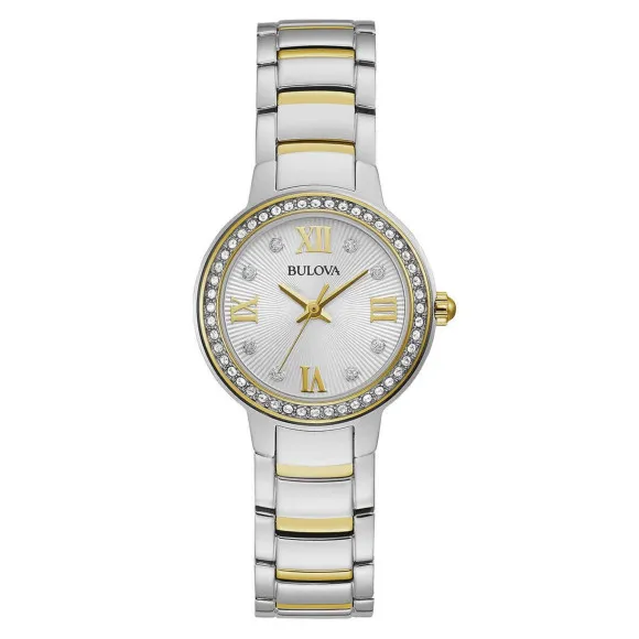 Die Bulova® Analoguhr für Damen 98L271 ist eine atemberaubende Verkörperung von Eleganz und Raffinesse, perfekt gestaltet für die moderne Frau. Aus hochwertigem Edelstahl gefertigt, misst das runde Gehäuse in einem eleganten Silberton 27mm im Durchmesser und 7mm in der Dicke und ist damit ein ideales Accessoire für Tags- und Abendveranstaltungen. Ihre raffinierte Quarzbewegung gewährleistet präzise Zeitmessung, sodass Sie Ihren anspruchsvollen Zeitplan mit Zuversicht annehmen können. Der mit funkelnden Swarovski-Kristallen geschmückte Gehäuserand fängt das Licht auf wunderbare Weise ein und verleiht der Uhr einen einzigartigen Charme, der das Gesamtbild hebt. Das silberne Zifferblatt, geschützt durch robustes Mineralglas, wird elegant von einem mehrfarbigen Edelstahlarmband ergänzt, das sich angenehm um Ihr Handgelenk schmiegt. Mit einer Länge von 19cm und einer Breite von 14mm verleiht dieses Armband einen stilvollen Akzent und macht es zu einer vielseitigen Wahl für verschiedene Anlässe. Mit einer Wasserdichtigkeit von 3 bar ist diese Uhr für den täglichen Gebrauch geeignet und ermöglicht es Ihnen, das Leben ohne Zögern zu meistern. Der Schmetterlingsverschluss mit Druckknopfmechanismus sorgt für zusätzliche Sicherheit und Komfort. Ob bei einem formellen Ereignis oder einem entspannten Tag, die Bulova Analoguhr für Damen ist ein zeitloses Stück, das nicht nur seinen Zweck erfüllt, sondern auch Ihren Stil aufwertet. Shop Bulova® Analoguhr für Damen 98L271 bei Ormoda