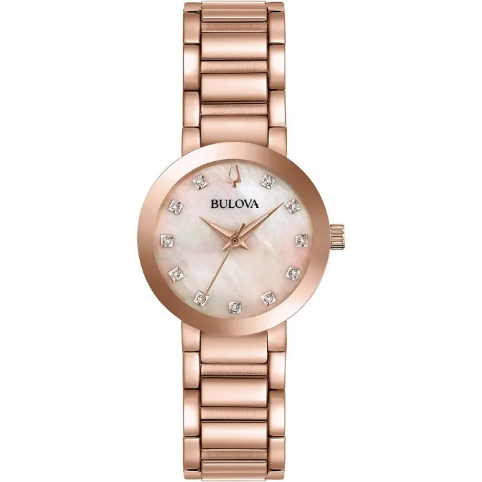 Die Bulova Analogue 'Futuro' Damenarmbanduhr 97P132 verkörpert Eleganz und Raffinesse in einem. Dieses Zeitstück wurde für die moderne Frau entworfen und verbindet mühelos Funktionalität mit exquisitem Stil. Das luxuriöse Gehäuse aus roségoldfarbenem Edelstahl hat einen Durchmesser von 30 mm und eine Dicke von nur 7 mm, was ihm eine zarte, aber zugleich robuste Präsenz am Handgelenk verleiht. Die runde Form strahlt zeitlosen Charme aus, während das Mineralglas des Zifferblatts die Haltbarkeit gewährleistet, die für den täglichen Gebrauch unerlässlich ist. Das Zifferblatt aus wunderschönem Perlmutt eröffnet einen Blick auf die feinen Designelemente, die seinen schlanken Charakter unterstreichen. Ein eleganter Faltverschluss sichert die Uhr am Handgelenk. Mit einer Länge von 19 cm und einer komfortablen Breite von 16 mm schmiegt sie sich perfekt an Ihr Handgelenk. Die funkelnden Diamantakzente fangen das Licht ein und verleihen jedem Outfit das gewisse Etwas, egal ob beim entspannten Brunch oder beim eleganten Abendessen. Diese quartzbetriebene Schönheit ist nicht nur ein funktionales Accessoire, sondern ein Statement Ihres exquisiten Geschmacks. Mit einer Wasserdichtigkeit von bis zu 3 Bar ist diese Uhr praktisch für den Alltag, während sie dennoch ihre opulente Ästhetik bewahrt. Die Bulova Futuro wurde speziell für die einzigartigen Stilpräferenzen von Frauen entworfen und ist ein perfektes Geschenk für Sie selbst oder eine geliebte Person. Dieses charmante Zeitstück verkörpert das Gleichgewicht zwischen Luxus und Praktikabilität und ist für diejenigen gemacht, die die feinen Dinge im Leben zu schätzen wissen. Shop Bulova® Analogue 'Futuro' Damenarmbanduhr 97P132 bei Ormoda
