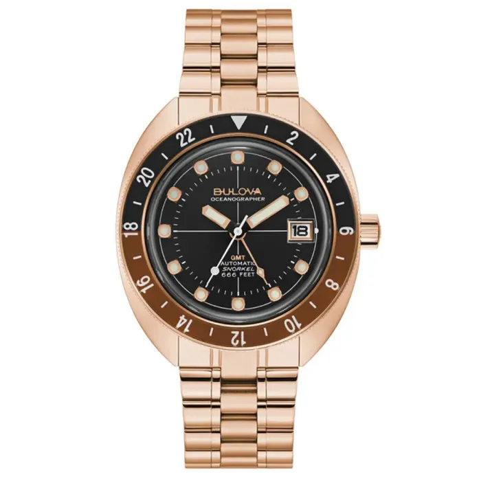 Die Bulova Analogue 'Oceanographer' Herrenuhr 97B215 ist eine Verkörperung des Bulova-Erbes, ein klassischer Zeitmesser mit einem luxuriösen Touch, der gleichzeitig maskulin und professionell wirkt. Erbaut mit einem anspruchsvollen automatischen Uhrwerk, zeigt diese Uhr perfekt die Verbindung von Ingenieurskunst und handwerklichem Können. Ihr Gehäuse in Roségold-Farbton strahlt eine warme, anziehende Eleganz aus, gepaart mit einem runden Edelstahlgehäuse, das robust und dennoch raffiniert ist. Das schwarze Zifferblatt wird durch saphirglasgeschützt und kontrastiert wunderschön mit der Roségold-Farbe, während die drehbare Lünette nicht nur funktionell, sondern auch ein markanter Designakzent ist. Die Uhr besitzt eine Wasserdichtigkeit von 20 Bars, was sie zum perfekten Begleiter für den professionellen Taucher oder für den Alltag macht, wo sie zuverlässige Leistung und Resilienz gegenüber den Elementen beweist. Das 21 cm lange und 19 mm breite Edelstahlarmband in Roségold bietet ein sicheres und komfortables Trageerlebnis durch sein innovatives Faltschloss mit Tastendruck. Das klare, analoge Display verfügt über eine Datumsanzeige, die Funktionalität mit Stil integriert, um sicherzustellen, dass jeder Blick auf die Uhr eine Freude ist.